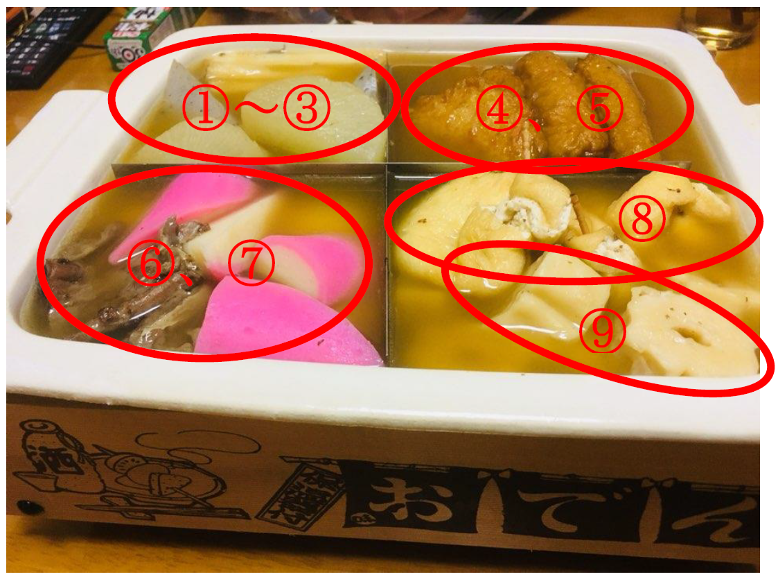 ⑥ 카마보코 어묵 / かまぼこ : 흰 살 생선을 잘게 갈아 밀가루를 넣고 뭉친 어묵