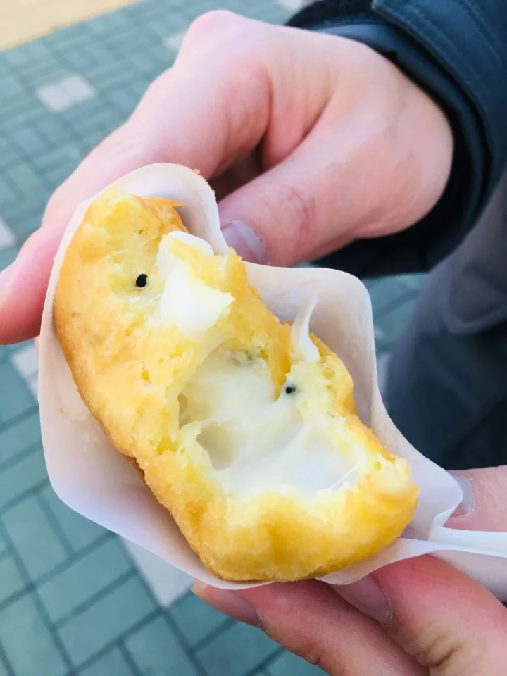 공룡알은 천 원에 2개를 먹을 수 있었는데 크기는 달걀보다 조금 큰 크기였고, 식감은 부드럽게 씹히다가 순식간에 입안에서 사라졌다. 그리고 천 원에 1개를 먹을 수 있는 치즈도너츠는 일반적인 팥도너츠의 빵 안에 치즈가 들어있었는데 치즈에서 느껴지는 짠맛과 빵에 살짝 묻어 있는 설탕의 단맛이 어우러져 단짠의 환상적인 맛을 선사했다.