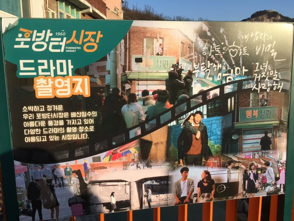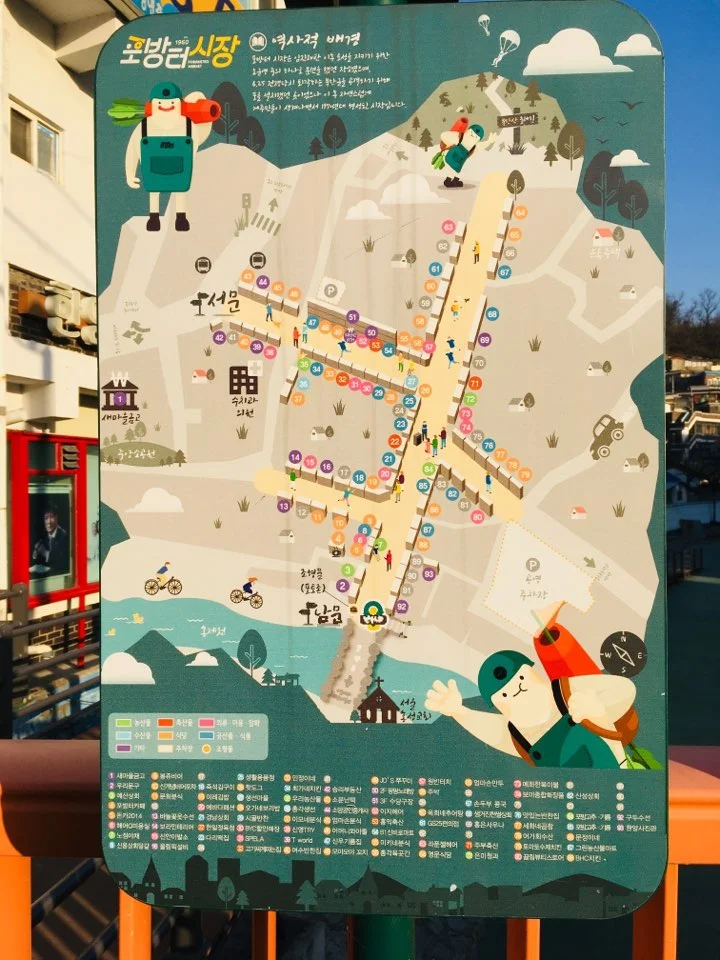 포방터시장의 남문에 다다르니 포방터시장을 소개하는 안내판이 있었다. 포방터시장이 배산임수의 아름다운 풍경을 가지고 있어서 다양한 드라마의 촬영 장소로 이용되고 있다고 소개하고 있었고, 포방터시장 전체를 살필 수 있는 지도판을 두어서 가고자 하는 상점에 찾아가기 용이하도록 방문객을 배려하고 있었다.
