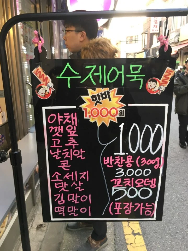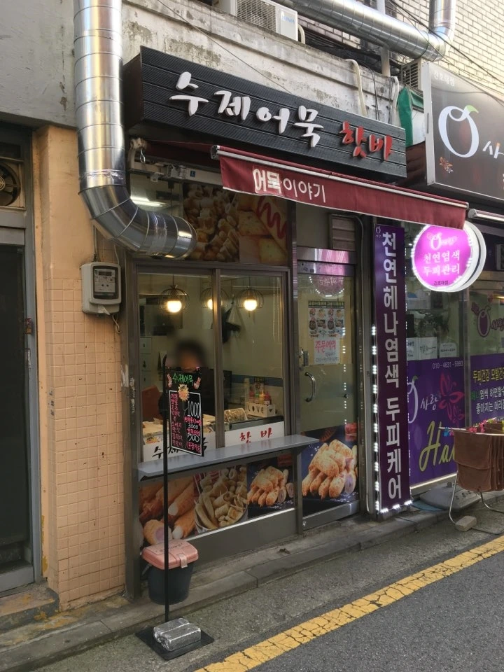 통밀빵집에서 나와 우리는 바로 앞의 수제어묵과 핫바를 파는 가게로 향했다. 구입한 통밀빵을 집에서 먹을 생각이었던 우리 부부는 그래도 포방터시장에 이르기 전에 배고픔을 달래줄 무언가가 필요했고, 눈앞에 나타난 수제어묵과 핫바를 취급하는 가게는 딱 우리에게 필요한 존재였다.