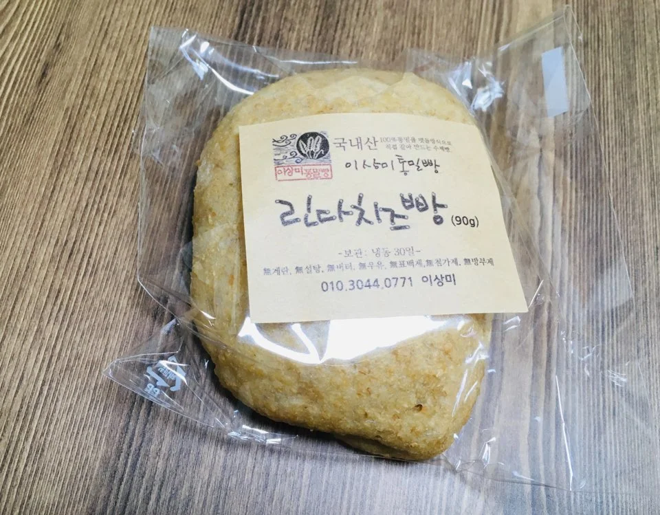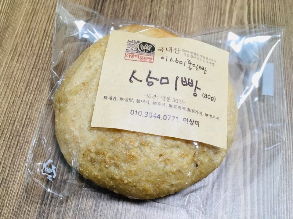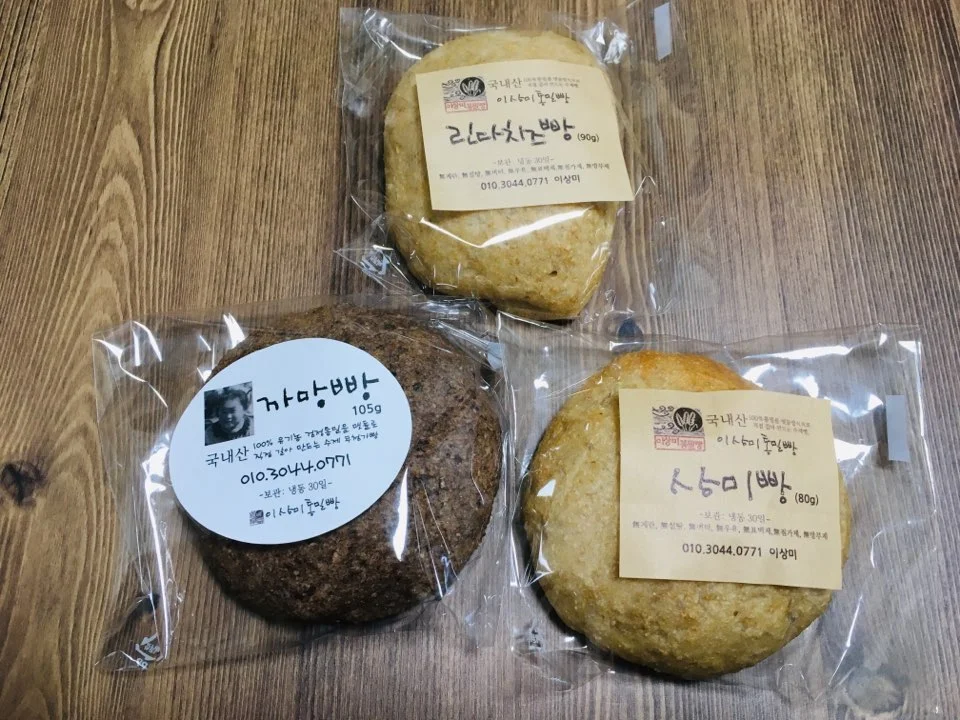 우리는 가게의 문을 열고 안으로 들어갔다. 매장의 내부는 좁았다. 두 사람이 들어가니 움직이기가 불편할 정도였다. 그러나 포근한 기운이 감도는 매장 내부에 우리는 금세 적응했고, 아기자기하게 포장된 통밀빵들을 차분하게 살펴보았다. 다양한 종류의 빵들이 바구니에 무심한 듯 담겨 있었는데 우리는 많은 생각을 하지 않고, 상미빵과 린다치즈빵 그리고 까망빵을 각 한 개씩 구입해서 가방에 넣었다.
