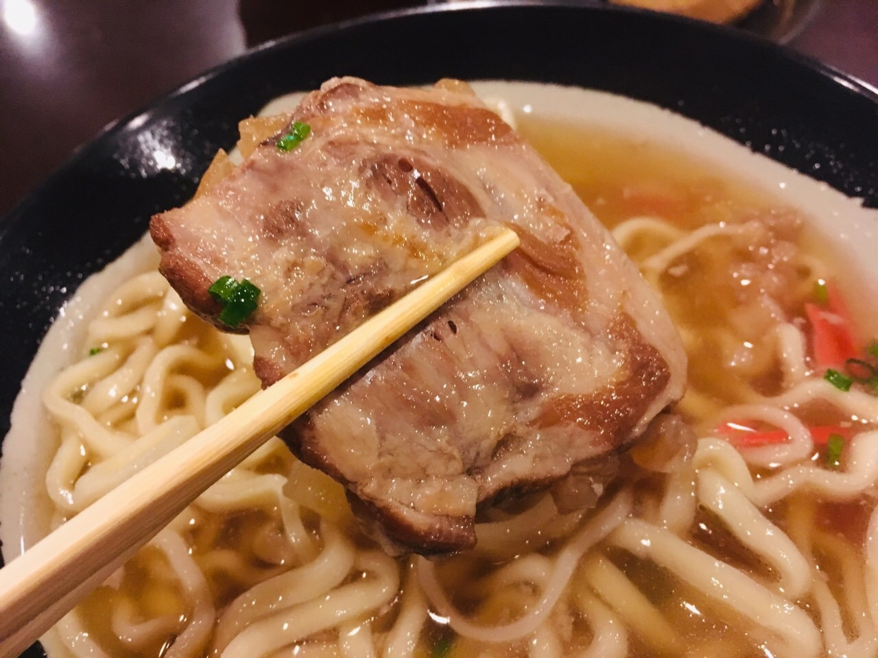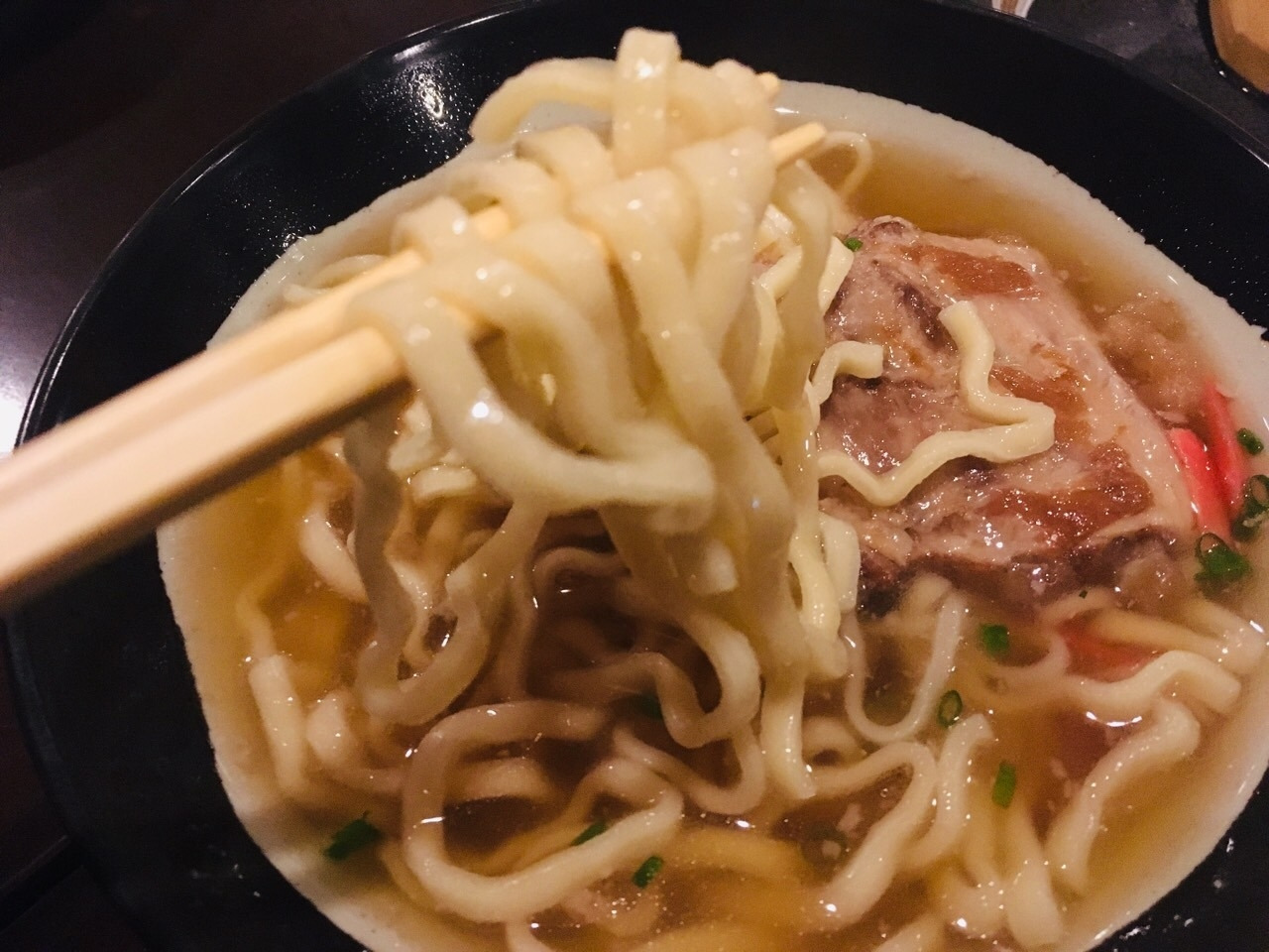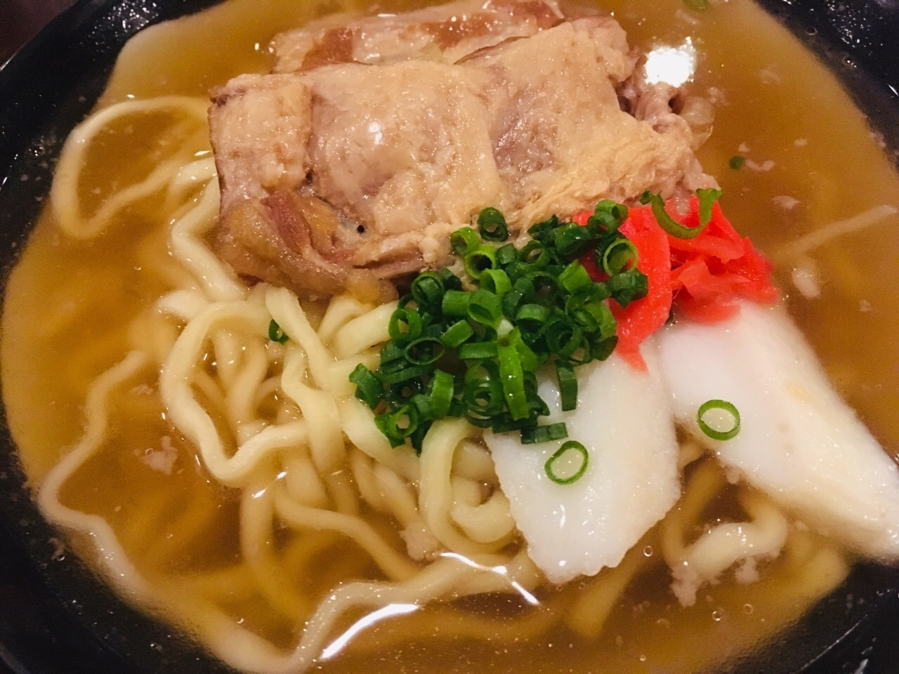"소-키 소바"는 오키나와식 우동입니다. 소바라는 단어를 붙였지만 메밀을 재료로 한 국수가 아니라 밀가루를 재료로 한 우동입니다. 우동의 면사리도 좀 특이했는데 마치 한국의 칼국수면 같은 모습이지만 식감은 쫄깃하기보다는 조금 눅진한 느낌이었습니다.