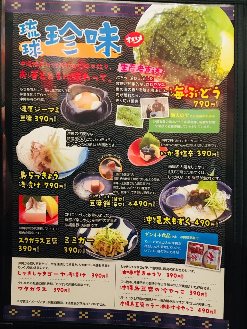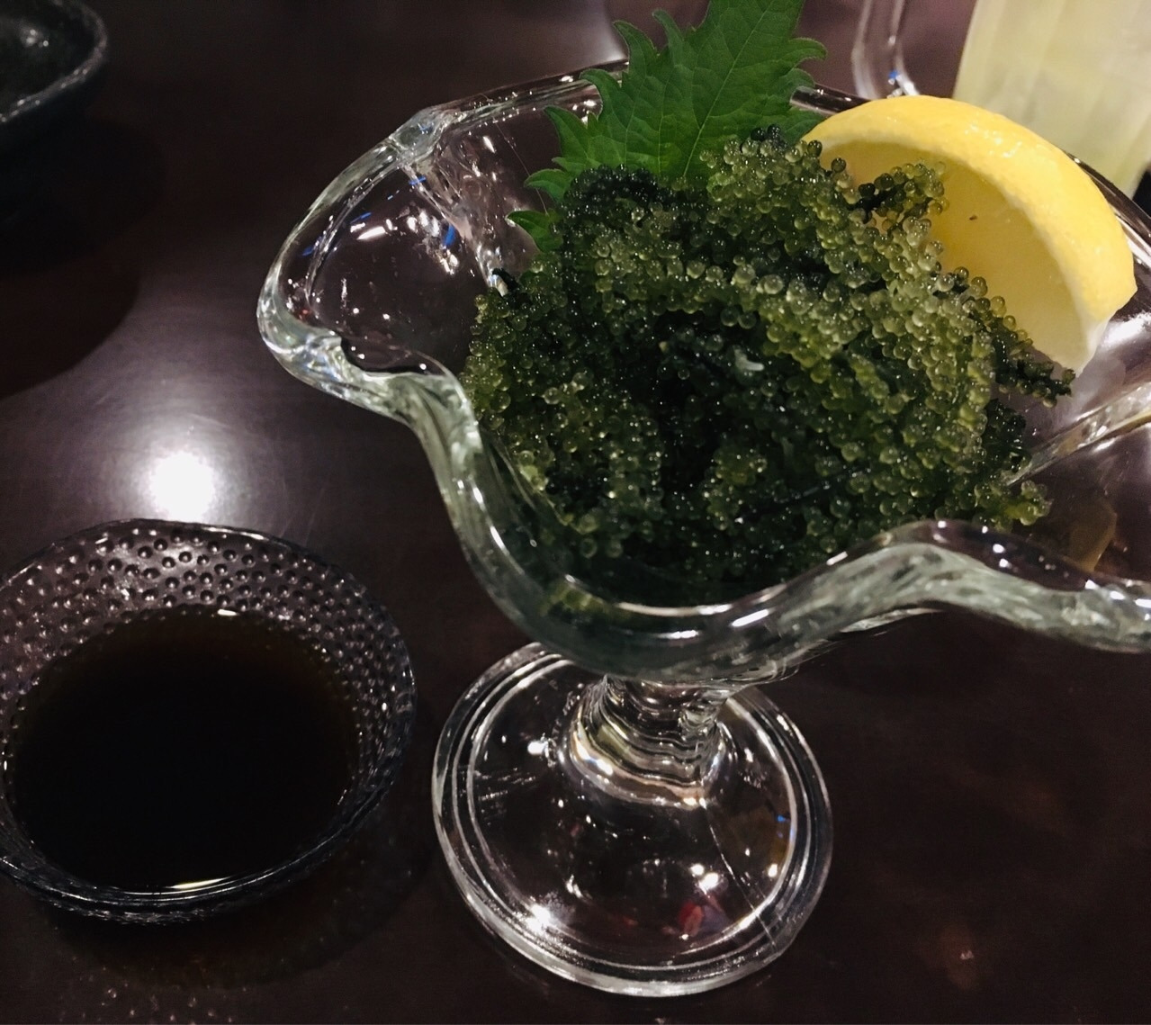 시콰사에 이어 오키나와에서만 나는 "우미부도(海ぶどう)"를 주문했습니다. '바다의 포도'라고도 하는 이것은 날치알의 덩어리처럼 생겼지만 생선의 알이 아니고 해초입니다. 입안에서 톡톡 터지는 식감이 독특했습니다.
