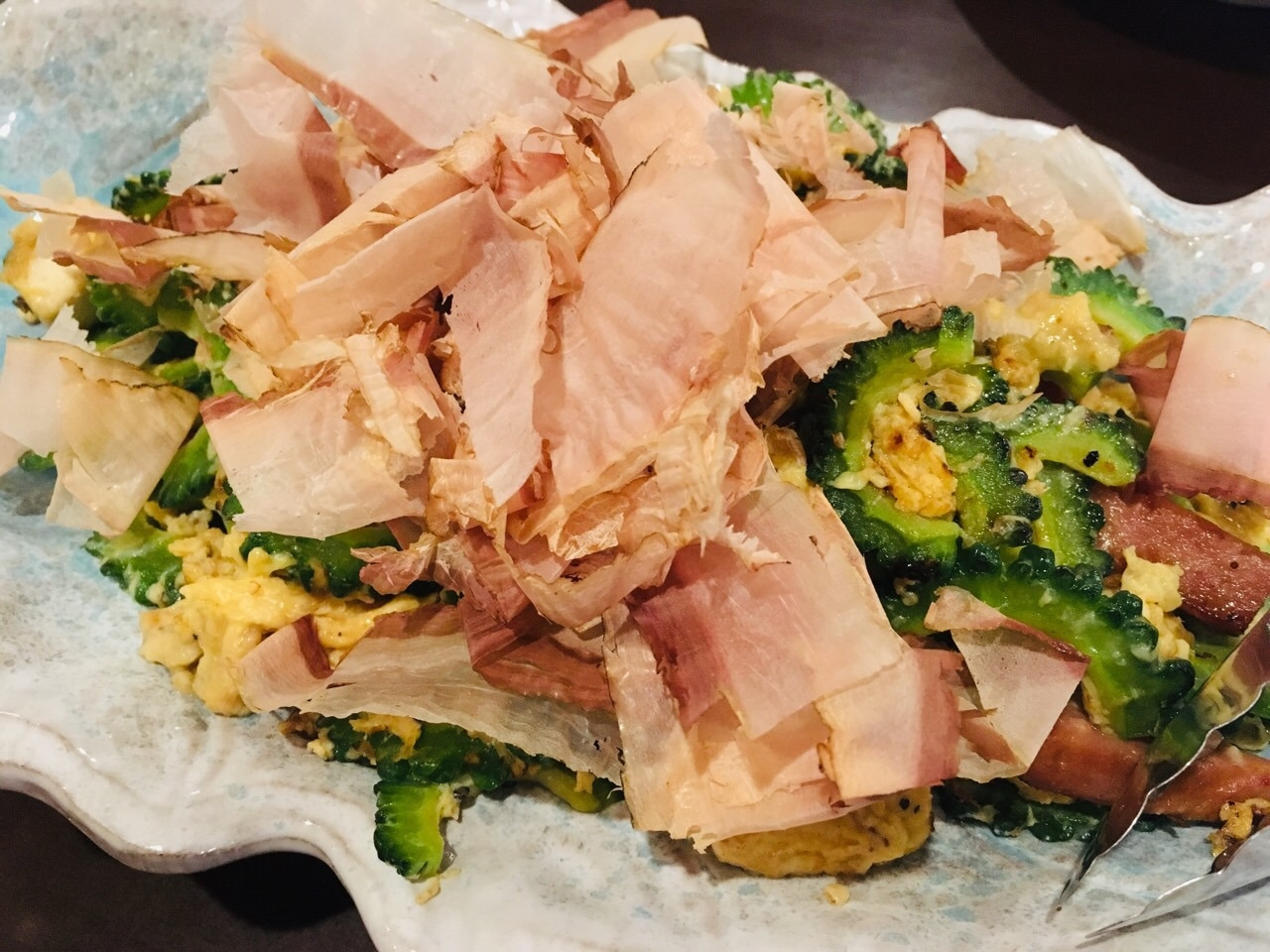 "고야창푸루"는 고야와 스팸 햄을 볶은 요리였습니다. 일본 사람들은 오키나와 사람들이 살면서 고야를 많이 먹기 때문에 장수한다는 생각을 가지고 있는데 그래서 그런지는 몰라도 고야의 씁쓸한 맛에 장수의 비밀이 숨겨져 있는 것 같았습니다.