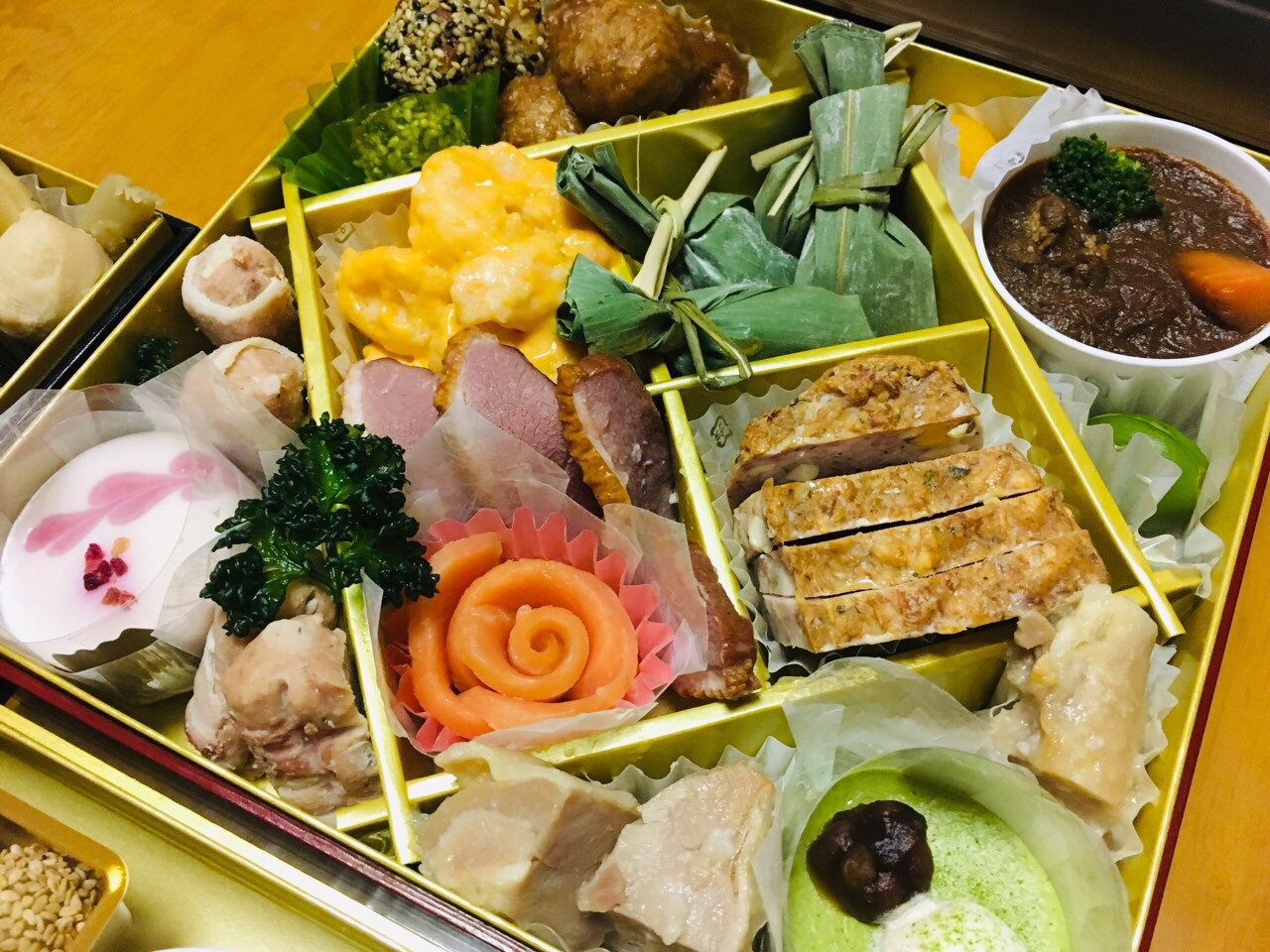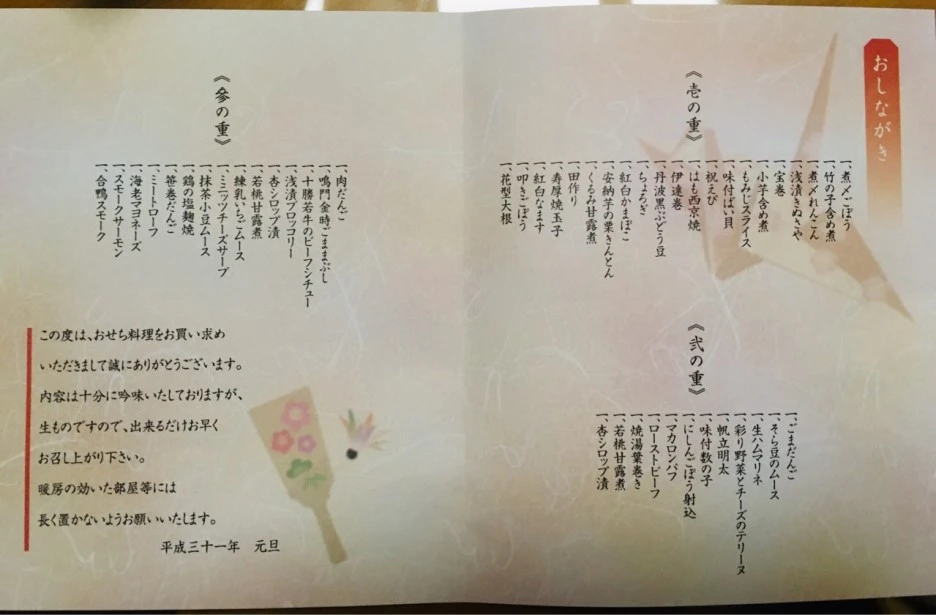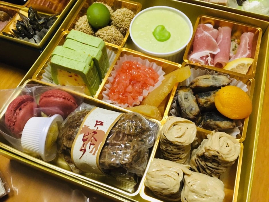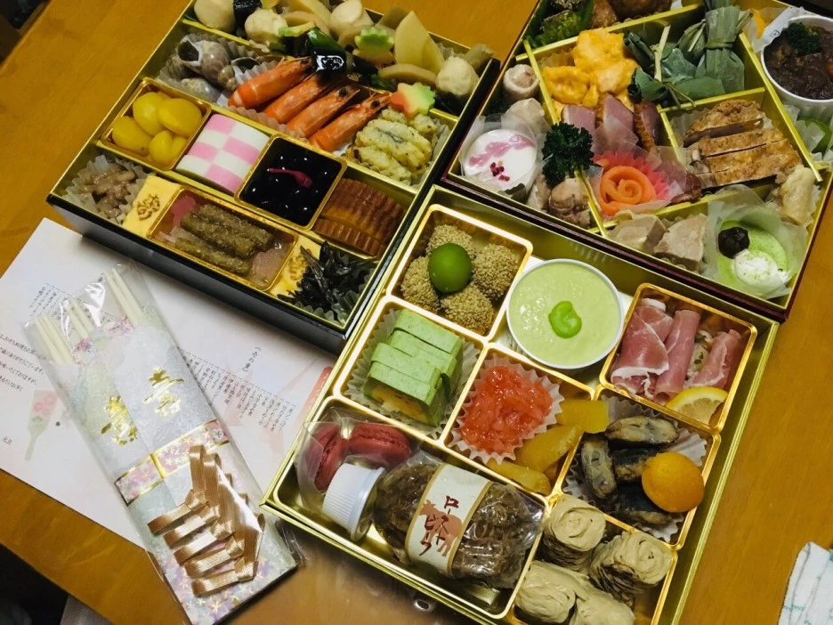 주문한 오세치요리는 화려했습니다. 다양한 종류의 요리들이 찬합에 담겨 있었는데 종류가 너무 많아 무엇부터 먹어야 할지 갈피를 잡기 어려웠습니다. 작년에 일본 처가댁을 방문했을 때는 장모님께서 사위의 일본 문화 경험을 위해 오세치요리를 직접 만들어 주셨는데 올해는 시중에서 팔고 있는 오세치요리도 사위가 경험할 수 있도록 특별 주문을 하셨습니다. 주문한 오세치요리의 가격은 한국 돈으로 약 30만 원 정도 하였습니다. 비싼 만큼 고급 식재료를 이용한 각종 절임 등이 3단으로 되어 있는 찬합에 빼곡히 담겨 있었습니다.