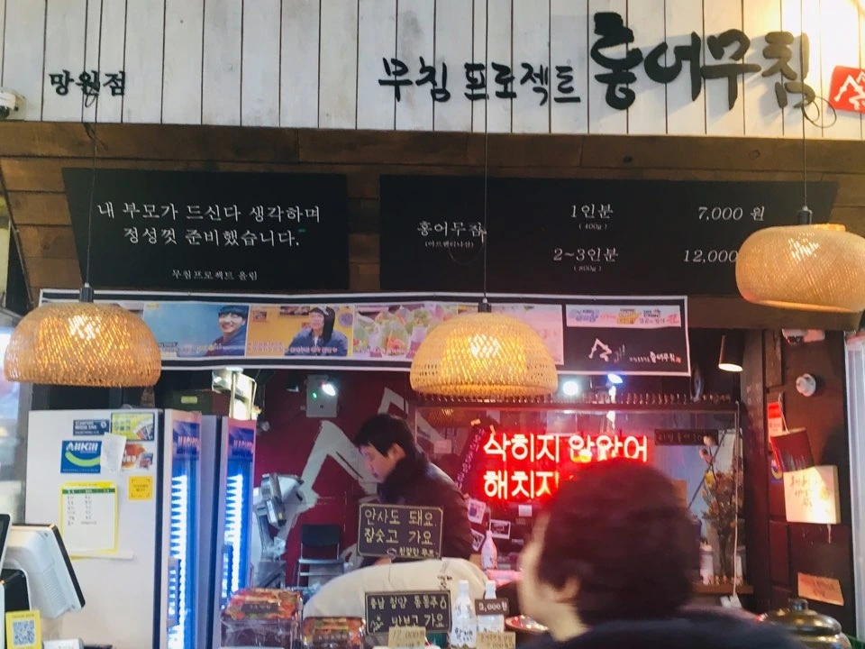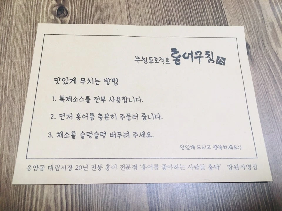 응암동 대림시장에서 20년 동안 홍어 전문점을 하다가 망원시장에도 점포를 낸 이 집은 포장을 해준 전체적인 구성도 깔끔했고, 또 직접 무쳐서 먹을 수 있게 되어 있어서 지금까지 보아왔던 전통시장의 홍어무침 집들과는 조금 달랐다. 작은 차이지만 좀 더 고객에게 다가가는 성의가 감사한 미소가 지어지는 집이었다.