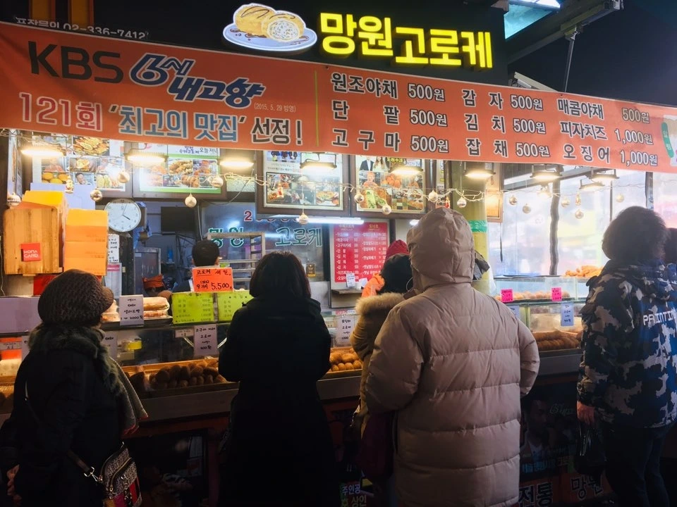 본격적으로 망원시장 탐방에 들어간 우리 부부는 우선 "망원 고로케"에서 도너츠 타임을 가졌다. 때마침 찹쌀 팥도너츠가 나온 때여서 따끈따끈한 팥도너츠를 맛볼 수 있었다. 가격도 도너츠 1개에 500원으로 저렴했는데 맛도 훌륭했다. 이 집은 계속해서 사람들이 몰리는 집이었다. 가게 앞으로 자연스럽게 사람 줄이 늘어섰고, 좀처럼 그 줄은 없어지지 않았다.