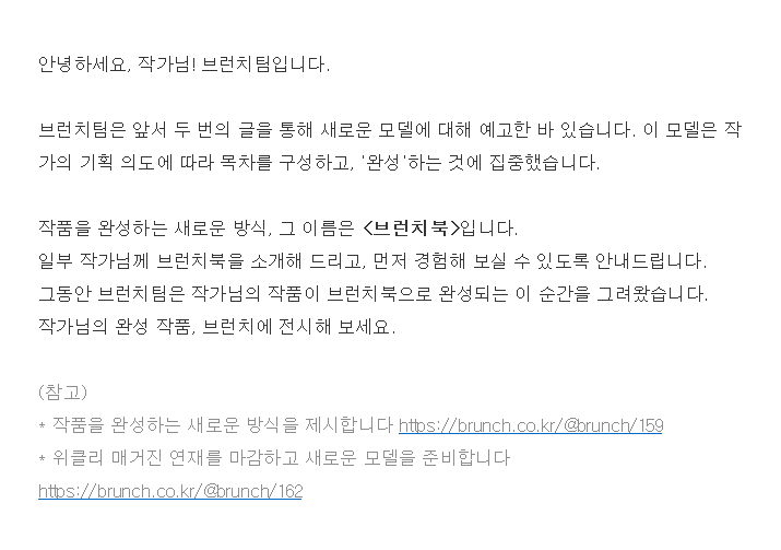 며칠 전, 브런치팀으로부터 한 통의 메일을 받았다. 그 내용은 작품을 완성하는 새로운 방식인 '브런치북'을 먼저 경험해보라는 것이었다. 한참 동안이나 갑작스러운 조회수 상승과 같은, 브런치를 통해 느꼈던 짜릿한 경험(?)을 못하고 있던 나는 브런치팀의 메일을 받는 순간, 실로 오래간만에 기분 좋은 짜릿함을 느꼈다.