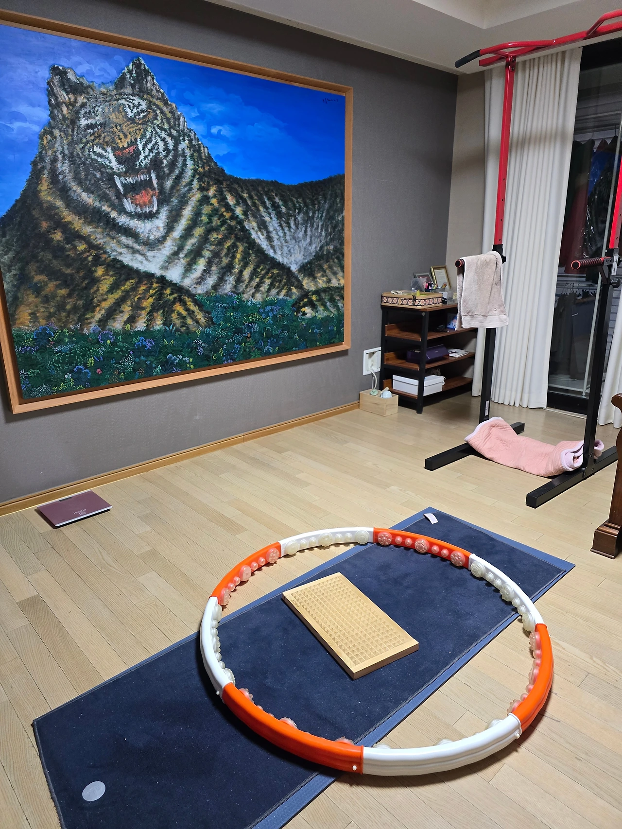 하루를 마무리하는 운동시간, 훌라후프를 하는데 허리의 굳은살에 난 상처가 덜 아프다.