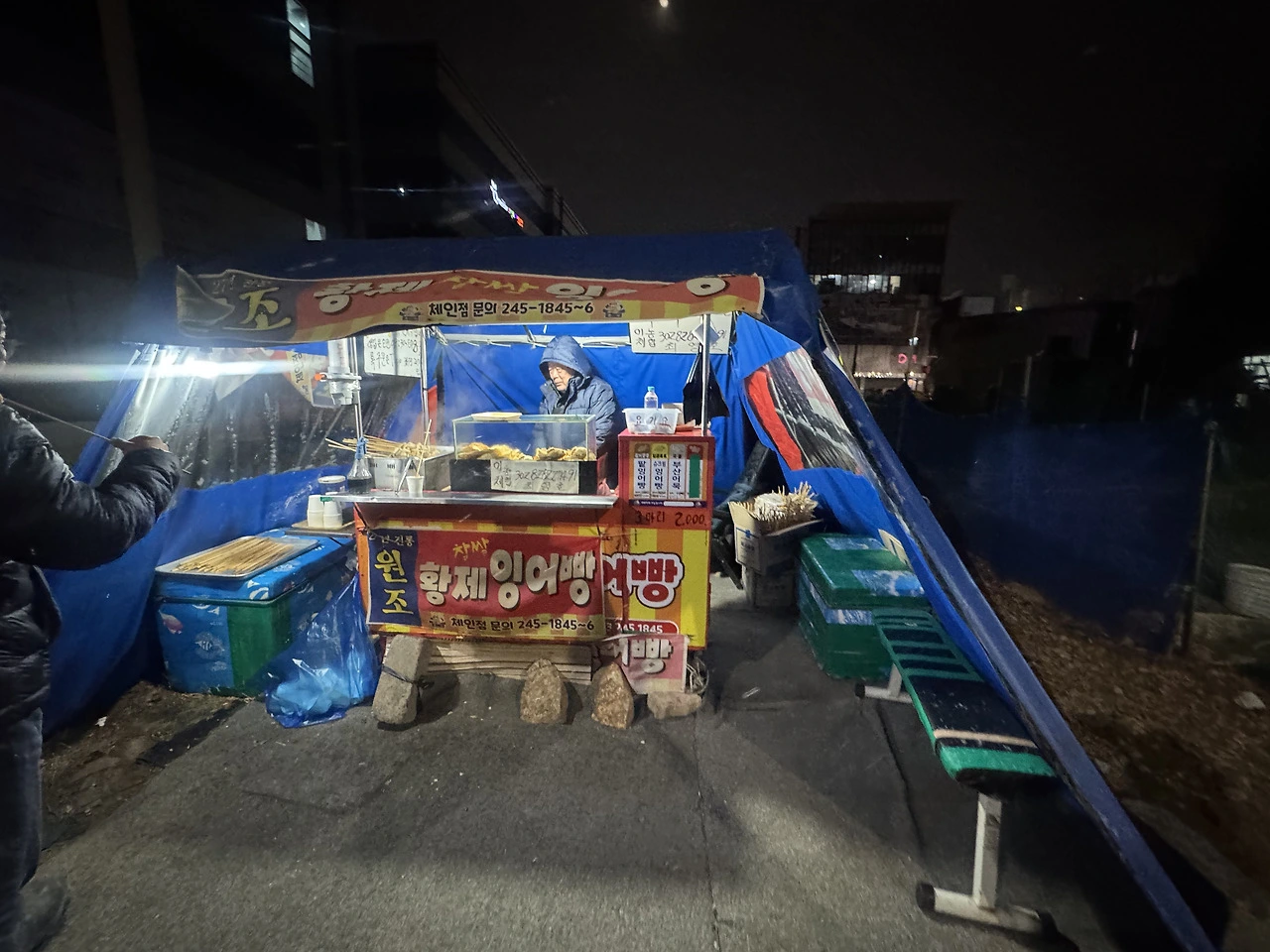집 근처 공용주차장앞, 붕어빵 포차의 주황빛 조명이 눈 속으로 번져 있었다.