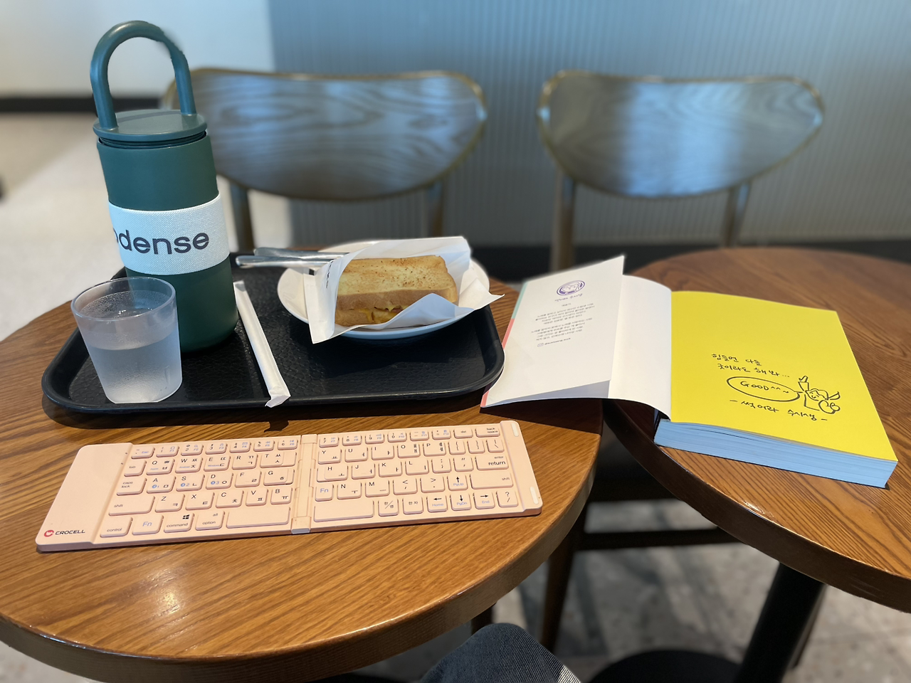 오늘은 할 일이 있어서 어쩔 수 없이 왔지. 집에서는 집중이 안 되고 누워있고만 싶거든.