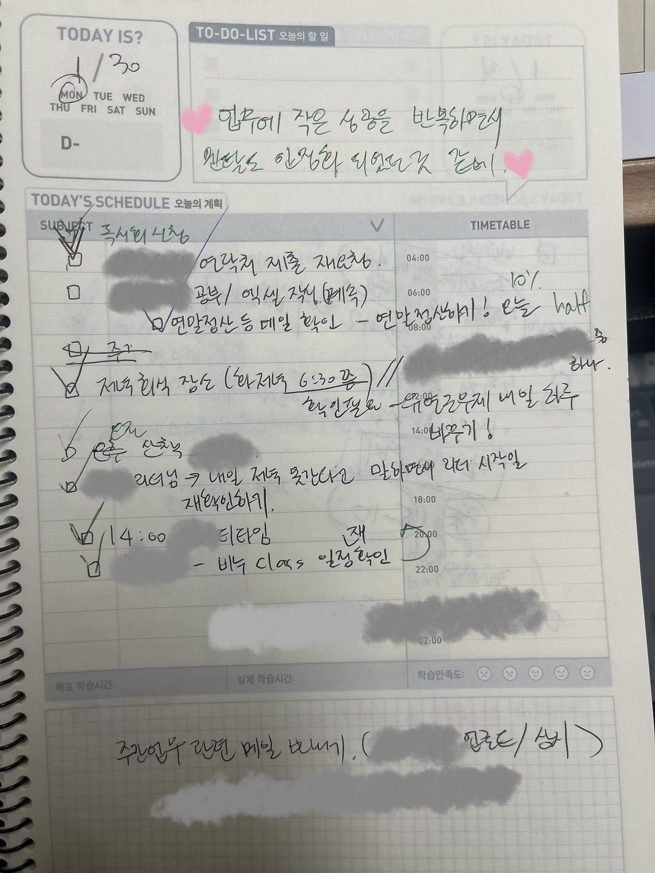 나중에 하루하루 아주 조금의 시간을 들여 작성한 페이지들을 넘겨보며 당신이 해낸 일들이 쌓여나간 것을 직접 볼 수 있습니다. 아주 작고 하찮은 일 같아도 적혀 있는 것을 보면 뿌듯합니다. ‘이런 귀찮은 일도 내가 그 날 했구나!’ 라구요.
