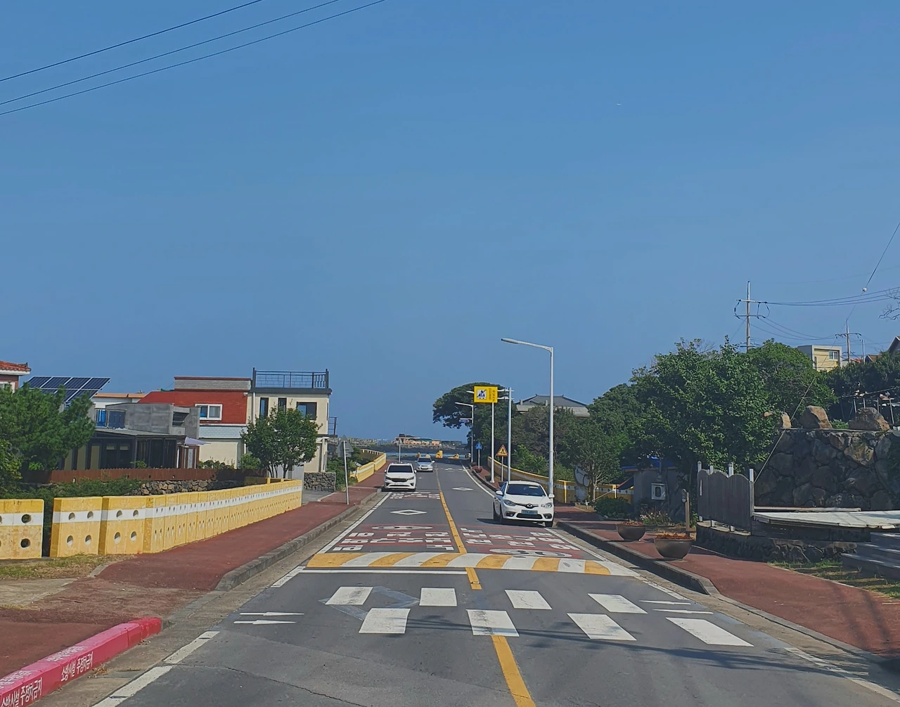 우리가 살고 있는 육지의 빽빽한 골목과는 다르게 여유 있게 간격을 둔 개성 있는 집들을 지나 드디어 바다가 나왔다. 우리는 육지 사람, 그것도 분지 도시 대구 사람답게 바다를 보고 호들갑을 떨었다. 우우와악! 야아아아아! 바다다, 바다!!!! 둘 중 누가 먼저 호들갑을 시작했는지는 잘 기억이 나지 않는다. 다만 누가 먼저랄 것도 없이 휴대폰을 들고 카메라를 켰던 것은 분명하다. 마치 바다를 처음 보는 양 아우성인 두 여자애가 재미있었던 사장님은 껄껄 웃으며 에잇, 제주에 온 기분 좀 제대로 내드려야겠다! 하면서 함덕 해수욕장을 지나는 쪽으로 길을 돌려주셨다. 아- 함덕. 함덕은 내게 나중에 꽤나 뜻깊은 곳이 된다. 곧 함덕에 얽힌 에피소드를 써 오도록 하겠다.