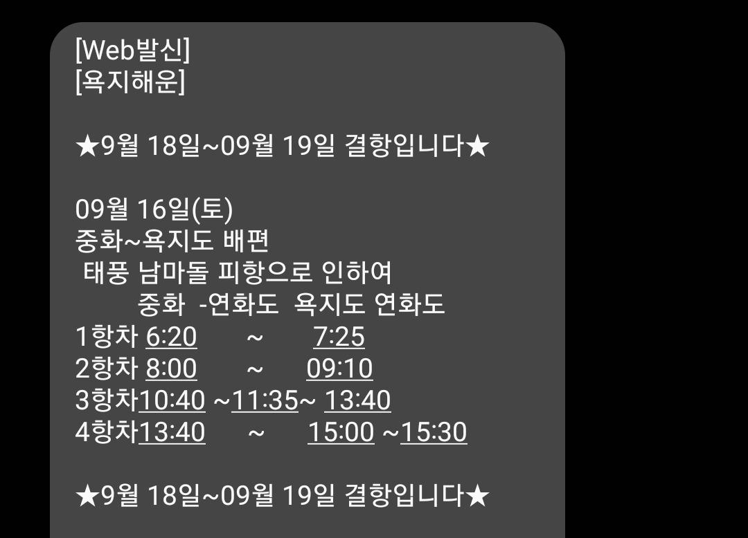 다 큰 가시내들이 남자 만나 시집갈 생각은 안 하고 노상 지들끼리만 놀러를 다닌다고 한 소리씩의 배웅을 받으면서도 그들은 야밤에 좋다고 집을 나섰다. 이번에도 복희가 운전대를 잡았다. 팅커벨 같은 외관과는 다르게 8기통 엔진 같은 소울을 가진 복희 덕분에 예정보다 빠르게 통영에 도착할 수 있었다. 이제는 통영 시장이 집 앞의 신평리 시장보다 더 훤한 정도였다. 분지 도시의 여자인 그들은 어쩐지 섬에 환장을 해 있었다. 제주도, 비진도를 부수고 이번에는 욕지도의 차례였다. 그러나 인생이란 마음먹은 대로 흐르지 않는 법. 대구에서 출발한 그들이 창원 쯔음 왔을 때였다. 춘자의 휴대폰으로 문자가 한 통 왔다. 내일 아침 욕지도로 들어갈 배를 예약한 해운이었다. <중화~욕지도 배편 태풍 난마돌 피항으로 인하여 9/18(일)~9/19(월)까지 결항입니다.>