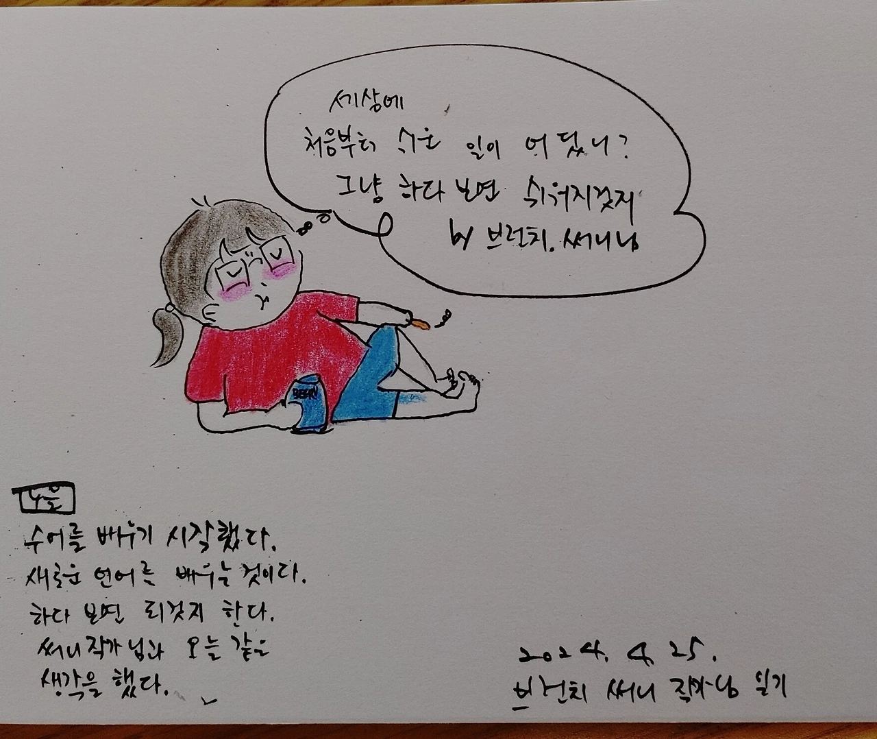 며칠 전 써니 작가님의 그림일기 "오늘을 남긴다] 그냥 하다 보면, 언젠가"를 보며 심기일전했다. 그리고 1일 1 그림 실천을 하자며 써니 작가님의 그림이 재미있기도 해서 그림을 따라 그려 보았다.