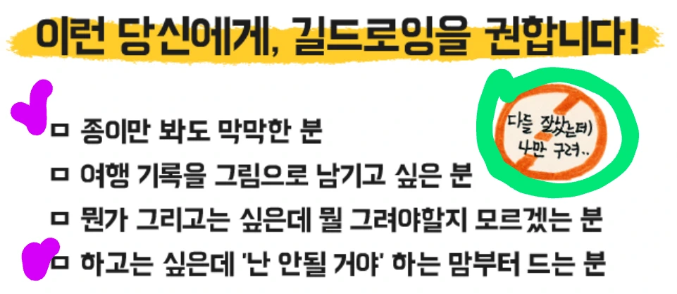 브런치작가님들 중에 그림일기를 발행하시는 분들이 있다. 짧은 글과 찰떡인 그림이 너무 재미있어서 나도 진짜 하고 싶었다. 그래서 그림 배우로 갈 때 그림일기 해야지 하고 갔는데 지금 나의 일기는 그날 하루 뭐 했는지 기록에 열중하여 그림이 없는 그림일기가 되어가고 있어 이 시점에서 주절주절을 멈추고 나도 딱 한 가지 뽀인뜨가 있는 그림일기를 해야겠어라고 다짐을 한다. 그런데 자꾸 그림의 퀄리티를 따지며 스케치북 앞에서 쭈뼛대고 있다. 못났다 ㅋㅋ.