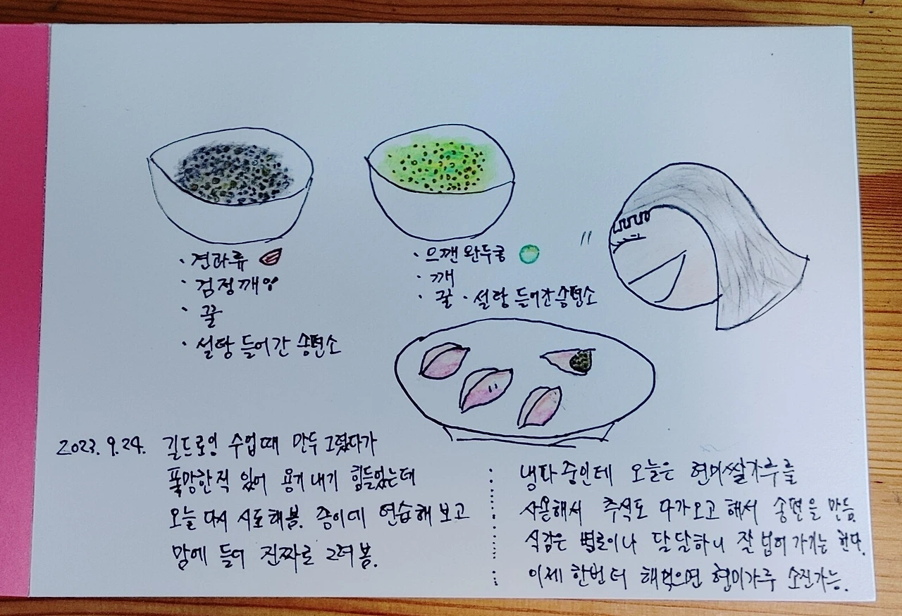엄마와 함께 만들 땐 송편소에 팥이랑 콩을 넣었던 것 같다. 나는 꿀떡을 좋아하니 내가 만든 송편은 깨와 꿀이 주가 되는 송편소를 넣었다. 100% 현미쌀가루이다 보니 약간 쓴맛도 나고 방앗간 송편의 쫀득함은 거의 없지만 오늘의 목표는 추석맞이 송편도 만들고 냉장고 식재료 소진이었으니