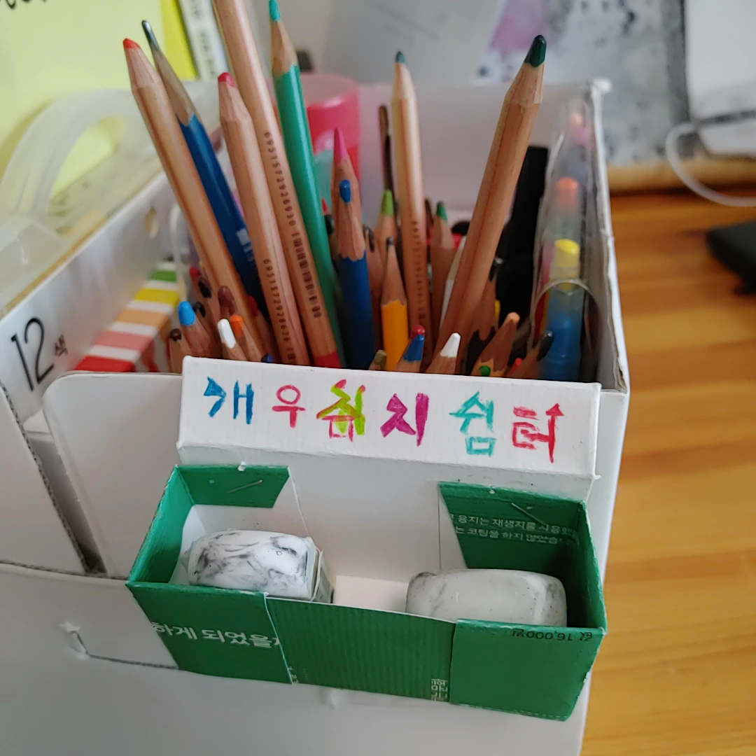 호작질 수준이지만 그림을 그리다 보니 뭔가 많이 생겼다. 너무 너저분하지 않도록 정리하다가 개우지(나는 지우개를 이렇게 부름)가 정착할 자리가 없어 돌아다니다가 가끔 숨어버리더라. 미술도구통에 개우지통을 하나 달아볼까 하고 호작질을 시작했다. 매우 진지하게 두어 번의 실패를 거쳐 개우지통을 완성해서 미술도구통에 달았다.심지어 이동식이다. 나의 호작질에 "공작"이 더 해진 경이로운 순간이다 캬~~오!!! 다양한 호작질 좋아 ㅋㅋ.