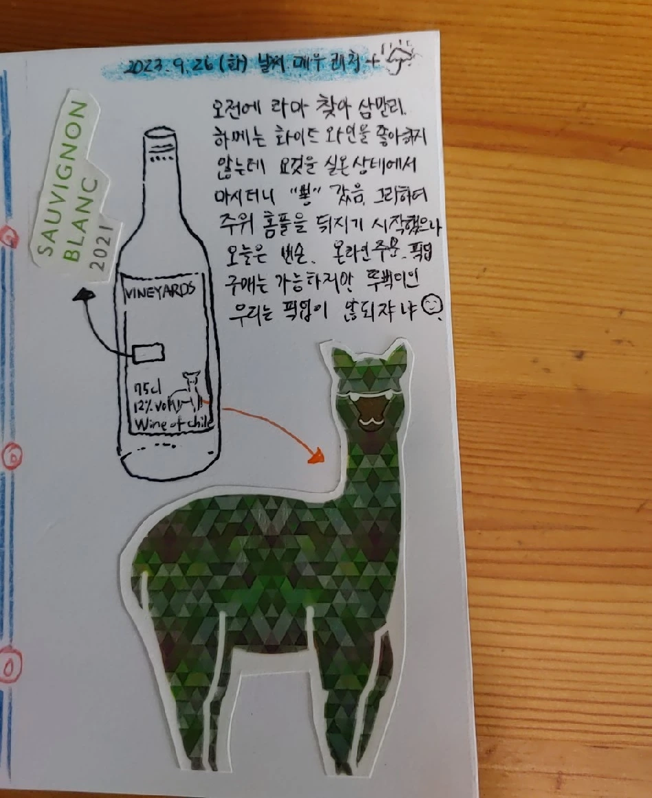 며칠 전 그림일기에는 병에 있는 라벨을 그리고 싶었는데 아직 그것을 유사하게라도 그릴 자신이 없어 어쩌지 하다가 ㅎㅎ 그래 오려 붙이자 하고 아주 아주 정성스레 라벨을 떼어내어 일기장에 붙였다. 그 라벨을 떼어내는 순간 행여 찢어질까 봐 손에 힘 조절을 위해 저절로 숨도 고르게 되는 경이로운 순간을 경험하며 이게 뭐라고 이렇게 정성을 들임?? 크크큭 혼자 웃었다.