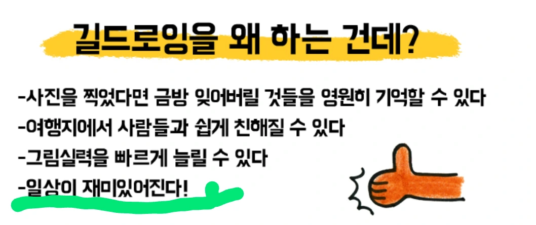 6주간 이다의 "끄적끄적 길드로잉" 수업을 받았다. 이 수업에 참가할까 말까 망설이는 나에게 "해봐"라는 용기를 준 워크숍의 광고 문구는 이랬다.