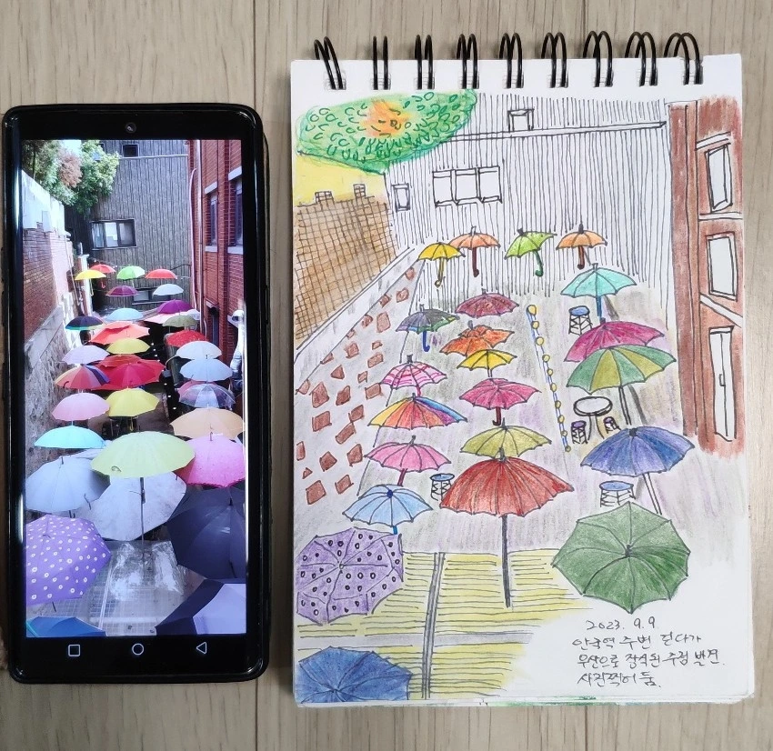 그림을 배우면서 그려보고 싶은 것이 많이 생겼다. 빨리빨리 그리지 못하므로 사진으로 담아놓고 매일 뭐든 하나씩 꺼내서 그리고 있다. 이 만큼의 우산을 그리고 나니 이제 우산은 대상을 보지 않고도 그릴 수 있을 것 같다는 생각이 든다.
