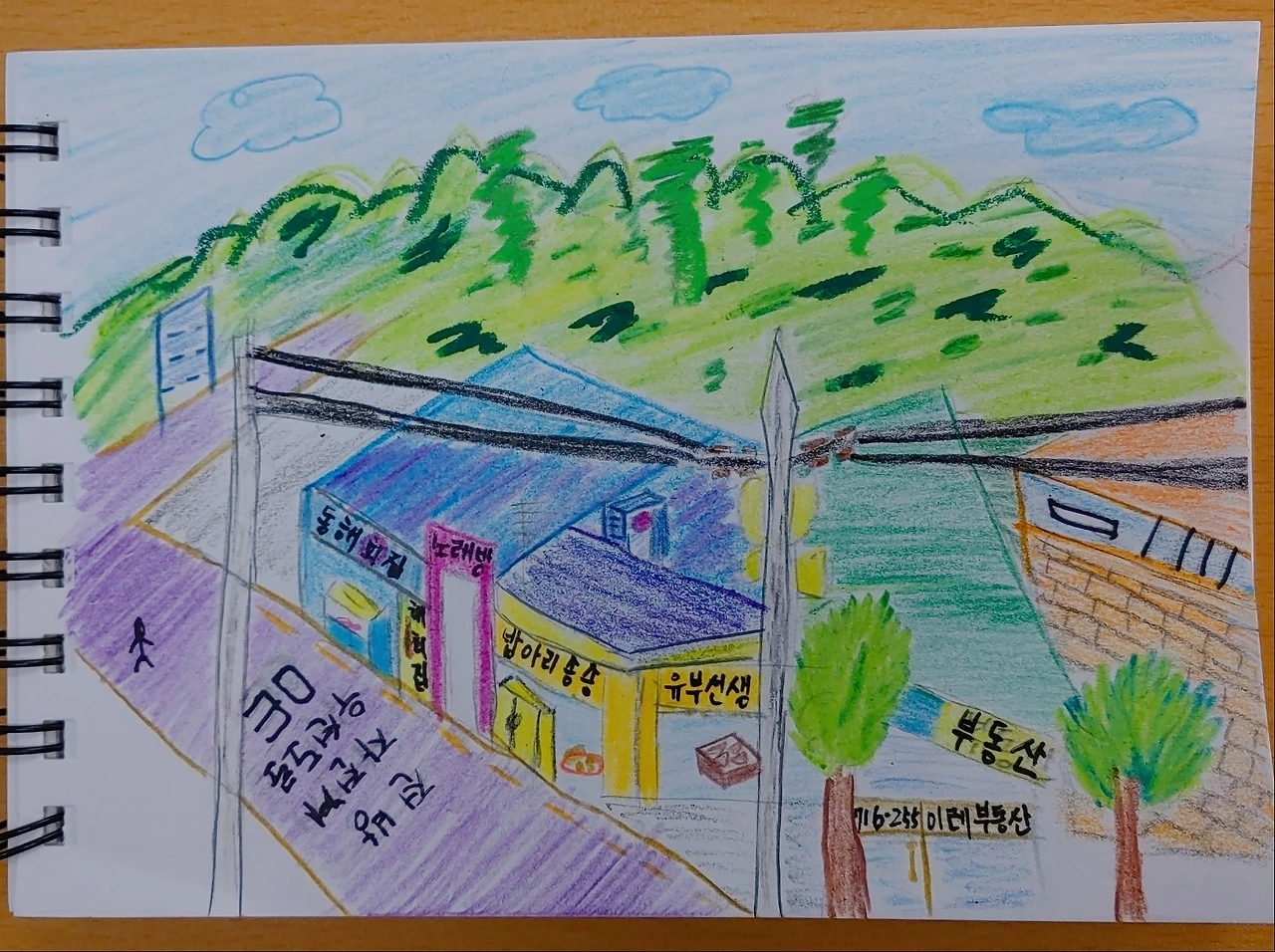 아파트 아래쪽의 초록 뭉탱이 같은 화단을 오일 파스텔을 이용해서 표현한 것이 제일 잘한 것 같아 뿌듯했던 그림이다.