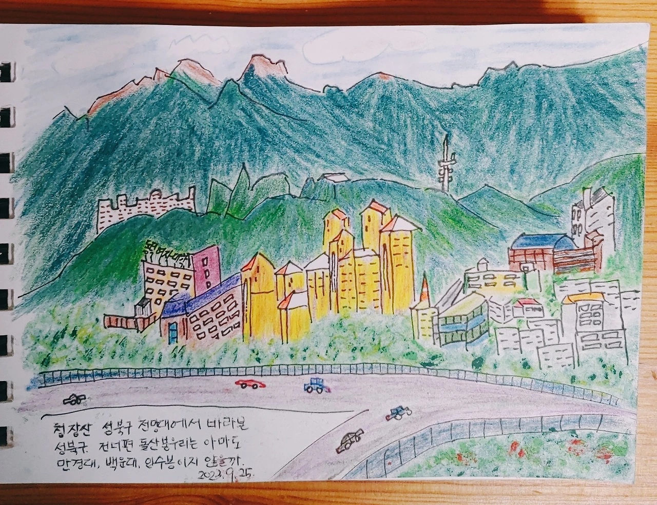 첫 그림이다. 선생님은 그림에 대한 부담감을 내려놓을 수 있게 여러 가지 설명을 하시고 바깥 풍경을 그려보라 해서 창밖으로 보이는 풍경을 처음으로 그려본 것이다. 미숙함이 덕지덕지 묻어있다.^-----^.누군가는 "에게게"라고 할 수 있는 수준이겠지만 초보인 나는 최선을 다해 선을 긋고 색을 칠한 결과이다. 스스로 평하면 구름이 진짜 별로다.