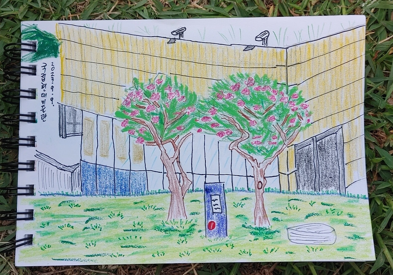 두 번째 야외수업에서 그린 국립현대미술관 뒤쪽 풍경 그림. 나무 그리는 실력이 조금 나아진 것이 보였다.