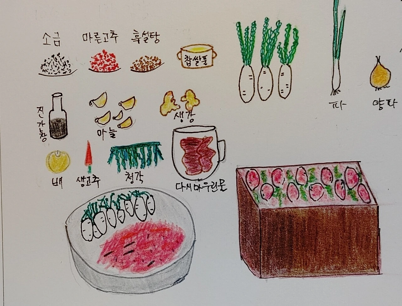 무도 다 같은 무가 아닌지라 나오는 시기도 다르고 김치로써의 쓰임새도 조금씩 다르다. 총각무가 나오기 시작하면서 동치미 무보다는 조금 작고 무표면이 하얀 무는 이름을 모르겠는데 육질이 연하고 맛있어 2주 전 조금 담았더니 요고요고 엄지 척이다. 김장으로 총각무는 처음인데 조금 큰 사이즈로 용감하게 5단을 담았다. 김치통 뚜껑을 덮으며 늘 그러는 것처럼 주문을 왼다 " 맛있게 익어 주세요." 미생물이 좋아는 먹거리를 골고루 넣어 주었으니 맛있게 익을 것이다.