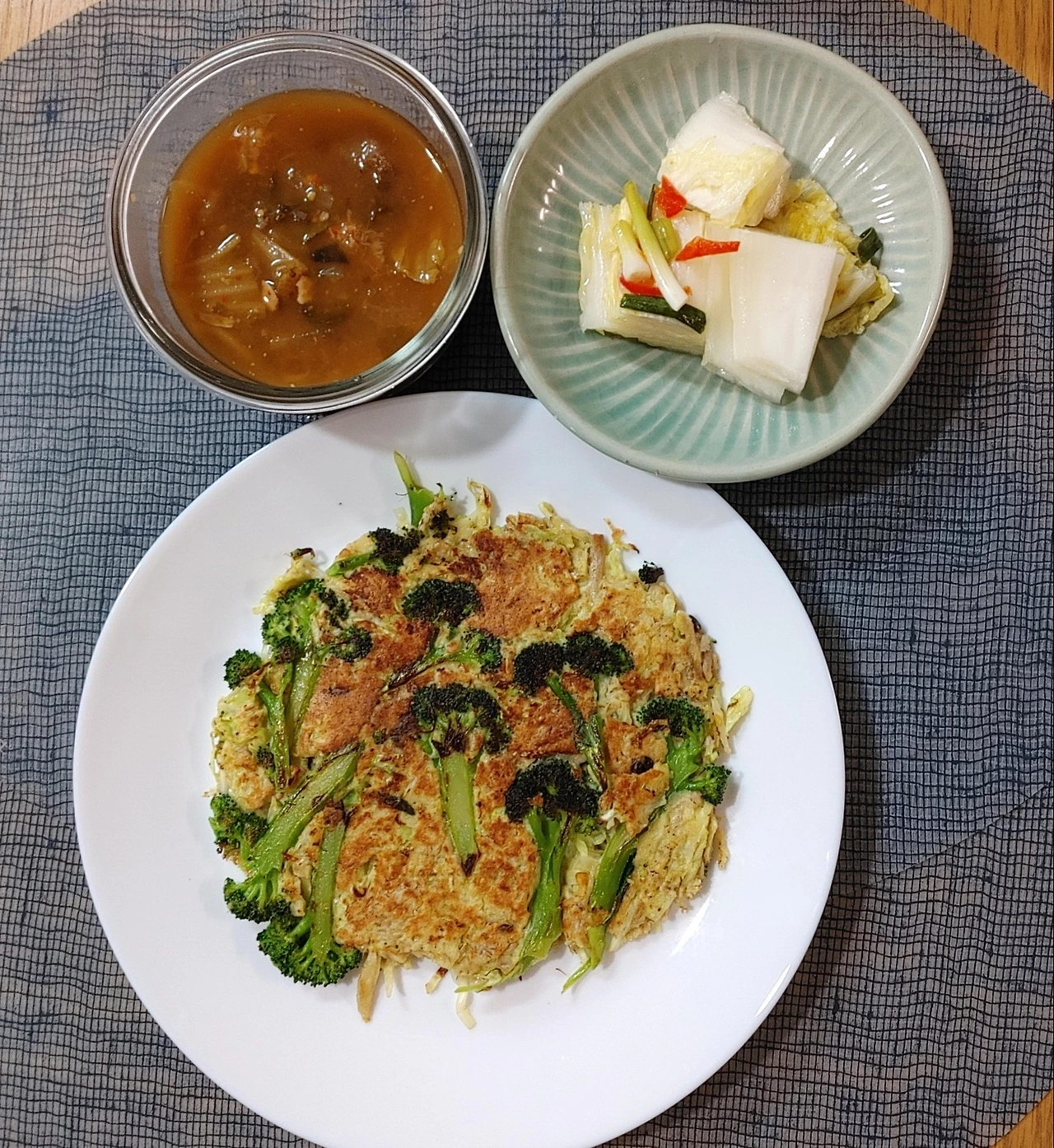 브로콜리를 팬에 먼저 깔고 그 위에 약간 촉촉하게 된 내용물을 올려서 굽는다. 밥대신 밀가루가 들어가지 않은 전이다. 기름도 가능하면 최소의 양을 사용한다. 된장국과 백김치를 곁들이니 밥처럼 한 끼가 되었다.