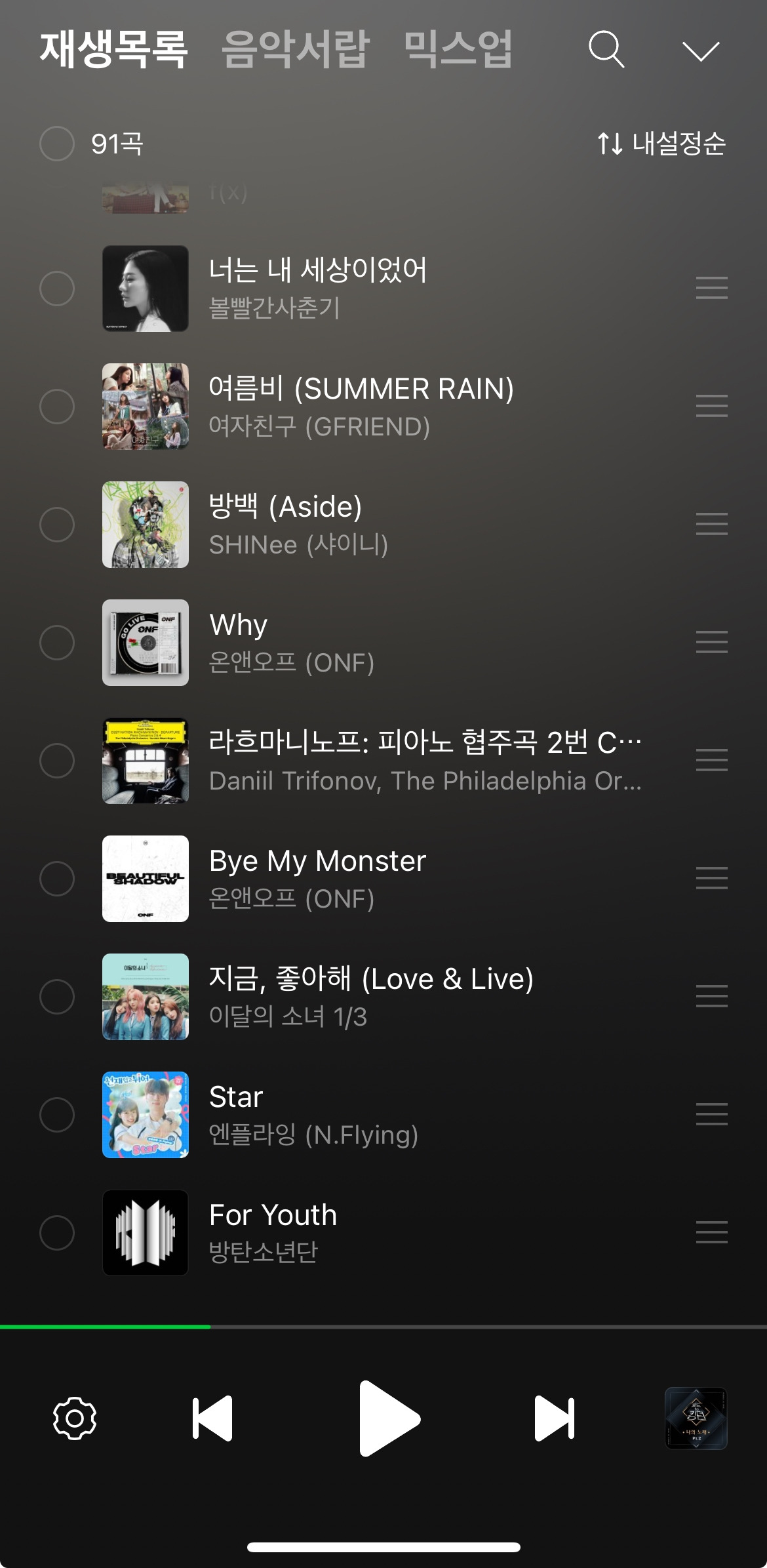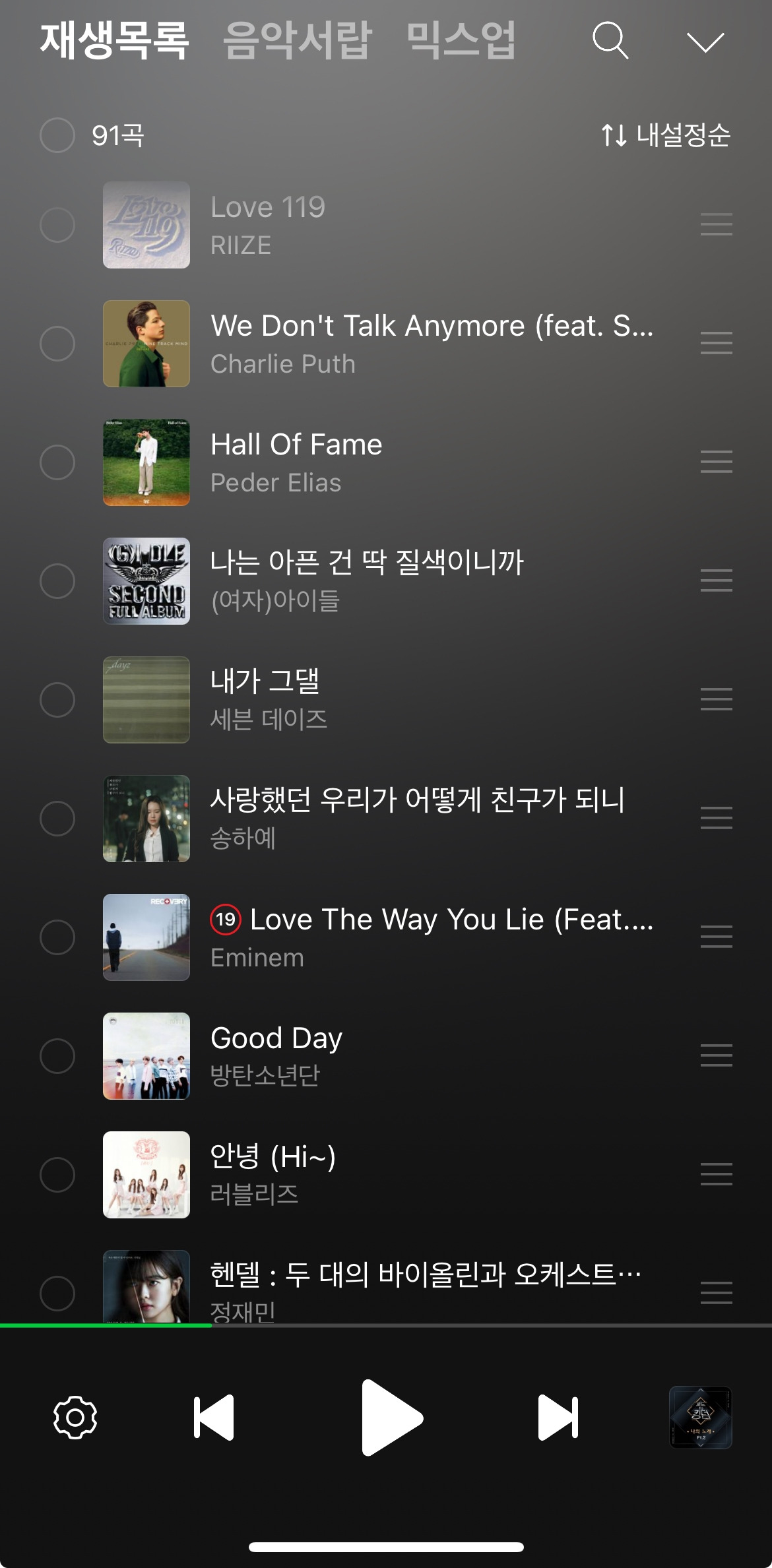 앨범 커버가 맘에 들어도 들어보고 그전 곡이 좋았던 가수면 일단 믿고 들어보고 플레이리스트에 추가하거나 뺀다.