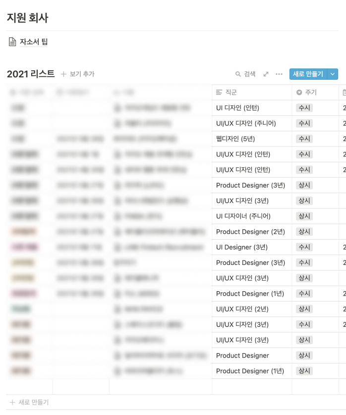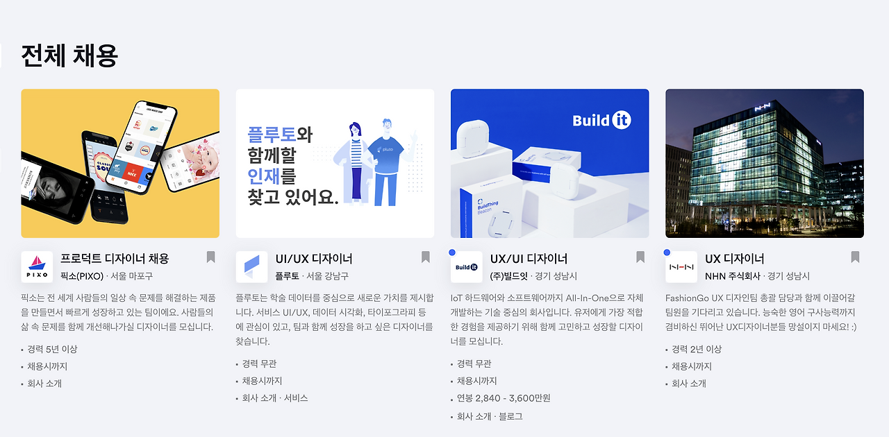 이 세 사이트의 경우에는 산발적으로 흩어져 있는 대기업, 중견기업의 자체 홈페이지 공고를 모아서 보기에 유용하지만 포지션 구분을 모호하게 표현한 기업이 수두룩하다. 예를 들어, 생각하고 있는 직군은 UX 디자이너인데 공고에는 '웹디자이너'라고만 표현되어 있거나 웹디자이너의 직무에 콘텐츠 디자인, 마케팅 디자인 등 여러 직군의 업무도 혼재되어 있는 식이다. 애초에 서비스에서 포지션 그룹을 시대에 맞게 잘 제공하고 있지도 않다는 감상이 크다. 그래서인지 대기업의 공채를 제외한 유효한 직군 공고를 찾아낸 적이 단 한 번도 없다... 하지만 합격자의 자료를 마음껏 얻을 수 있다는 점에서는 꽤 괜찮은 원천이다. 기업 합격 자소서나 최신 뉴스를 가공되지 않은 형태로 볼 수 있다는 장점이 있어서 필요할 때에 가끔 챙겨보는 정도.