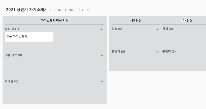 자소설닷컴의 캘린더 형식으로 되어 있는 채용 공고가 굉장히 유용하다. '자소설'닷컴이라는 네이밍 때문에 자소서 소스를 쉽게 모아볼 수 있는 서비스라 생각되지만 실제로는 잡코리아에 올라온 자소서를 리스트로 보여주는 정도. 서비스 전반에 걸쳐 UI/UX 디자인이라는 포지션이 웹/앱 디자인이라고만 표현되어 최근 동향을 잘 담아내지 못한 점이 아쉽다. 하지만 원티드에서 찾아볼 수 없는 대기업의 공고가 포함되어 있기도 하고, 무엇보다 캘린더 + 필터 조합으로 공고를 한눈에 가장 많이 파악할 수 있다는 장점이 크다. 또, 진행 중인 전형의 과정을 칸반 보드의 형태로 정리할 수 있는 기능이 있다는 점이 마음에 든다. (물론 응용프로그램인 노션이 압도적으로 더 편하긴 하다.)