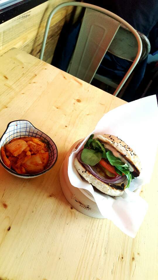 미테의 핫한 수제버거집, 시소버거. 딤섬을 담아내는 나무 상자에 햄버거를 서빙한다. 와규 패티는 물론, 불고기버거 메뉴가 따로 있고 사이드 메뉴에는 무려 김치가 적혀 있는 동북아시아 3국의 정체성이 고루 섞인 이곳. 외국인들이 환장(?)할 만하다. 막상 방문해보니 나는 생각보다 별다른 감흥이 일지 않았지만. 이 모든 것이 저조한 컨디션 때문이리라 믿으며 나중에 한번 더 와볼 생각이다. 시소버거에서 가장 비싼 메뉴에 고구마튀김과 맥주를 추가로 주문할 생각에 들떴던 아침은 어디로 가고, 나는 아래 사진과 같이 기본 치즈 버거에 김치를 시키는 만행을 저질렀으니 말이다. *진짜 무식해 보이는 결정인데, 김치를 먹으면 몸이 좀 나아지지 않을까라는 생각이 본능적으로 들었다. 그리고 생각보다 치즈 버거와 김치의 궁합이 잘 맞아 놀라기도 했다(변명).