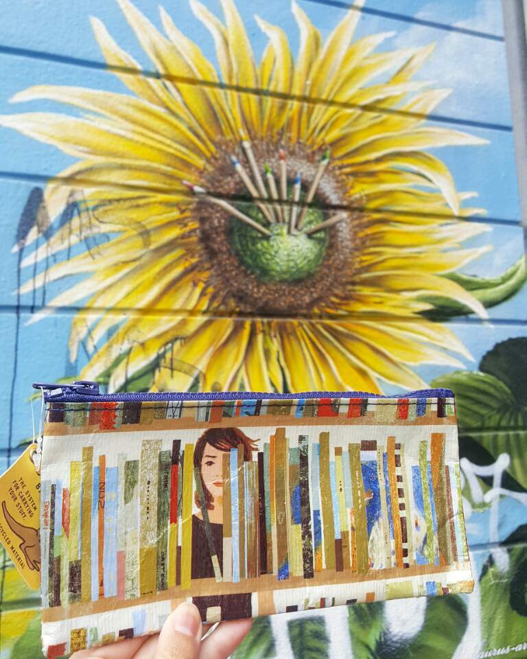 보물을 건지지 않을까 기대하며 카드를 챙겼지만 가먼츠도, 어제와 같이 마음 놓고 구경을 하려던 루이반을 주저 없이 건너뛰고 오직 시소버거를 향해 직진하던 길이었다. 그 사이 잠시 해가 떴(지만 바람은 여전했)고, 나는 예쁜 벽화로 손님을 맞이하는 또 다른 문구점과 우연히 맞닥뜨렸다. 영수증을 챙기지 않아 이름을 까먹은 이곳에서, 베를린에서 구입한(할) 문구용품을 담을 필통을 샀다. 어딘가 빈티지스러운 프린트와, 필통을 구성하는 재료의 95%가 재활용 소재라는 소개에 7유로를 지불했다. 저렴한 가격의 프라이탁을 사는 기분으로 말이다. 실은 책 사이에 얼굴을 절반만 드러낸-앞머리가 마구 휘날리는-여성이 꼭 내 모습 같아 보인 기분도 한몫했다.