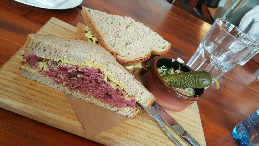 어제 들렸던 옛 유대인 여자기숙학교를 다시 찾았다. 1층에 위치해 있는 식당이 알고 보니 내 나름의 맛집 리스트에 작성해놓았던 모그&멜처였던 게 아닌가. 유럽에서 가장 맛있는 파스트라미(소고기를 소금과 마늘, 후추로 강하게 양념한 것) 샌드위치를 만든다고. 실로 진한 고기 맛이 일품이었지만 곁들인 코울슬로가 없었으면 너무 짜기만 해서 쉬이 물릴 것 같았다. (장점이기도 한데, 양이 너무 많다) 분명 맥주와 함께 먹으라는 계시 같았지만 나는 가난한 장기 여행자이니까 가방에 있던 탄산수로 입을 헹궜다. 참, 유럽에선 당연한 팁이지만 코울슬로 추가하면 돈 더 받아요(2.50유로). 샌드위치 자체는 생각보다 저렴했다(9.50유로).