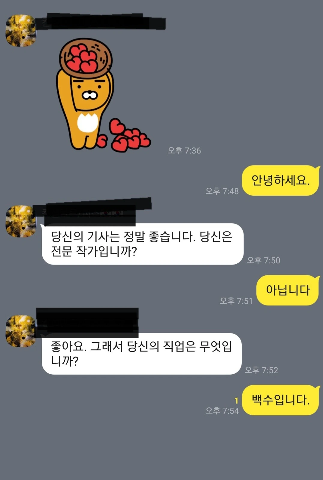 채팅방에 들어왔다. 왠 하트. 미친건가.