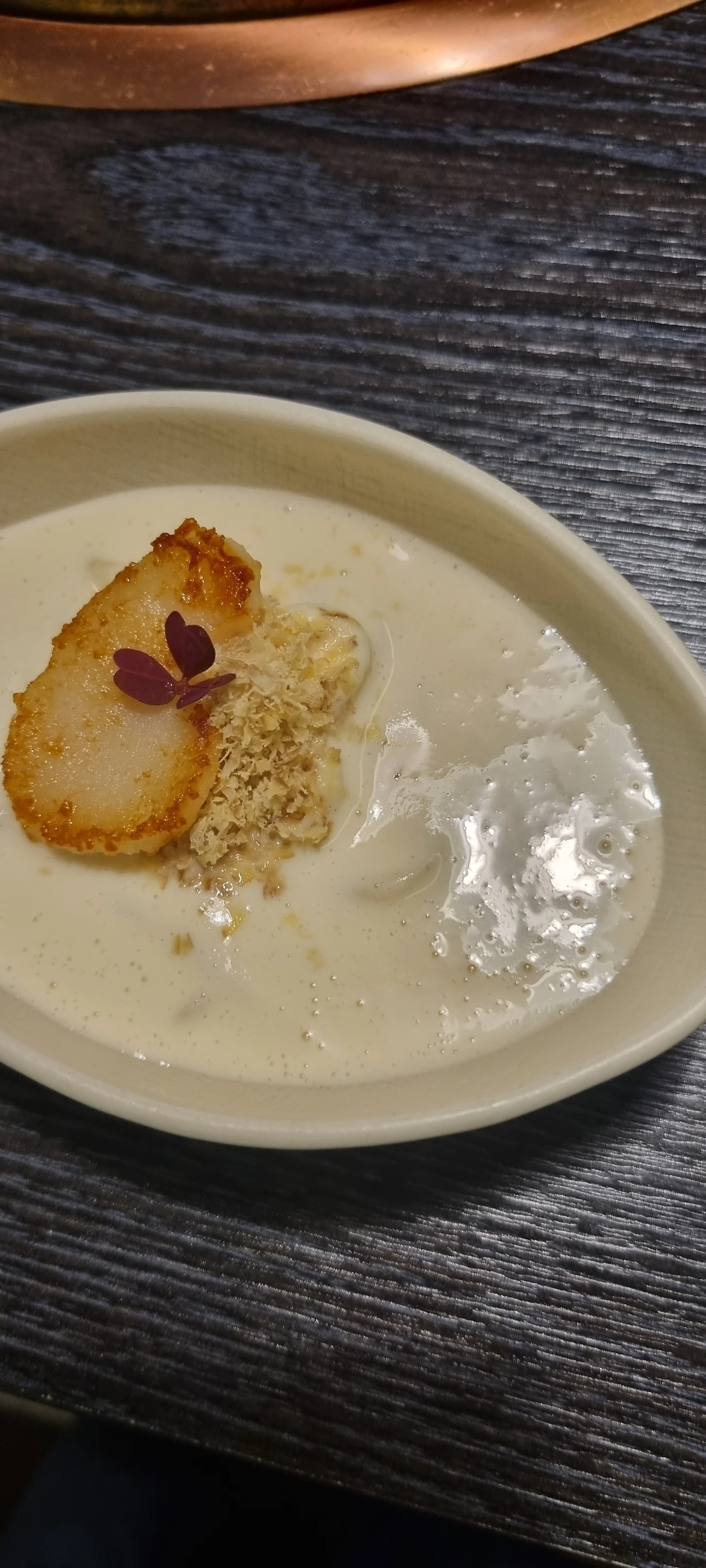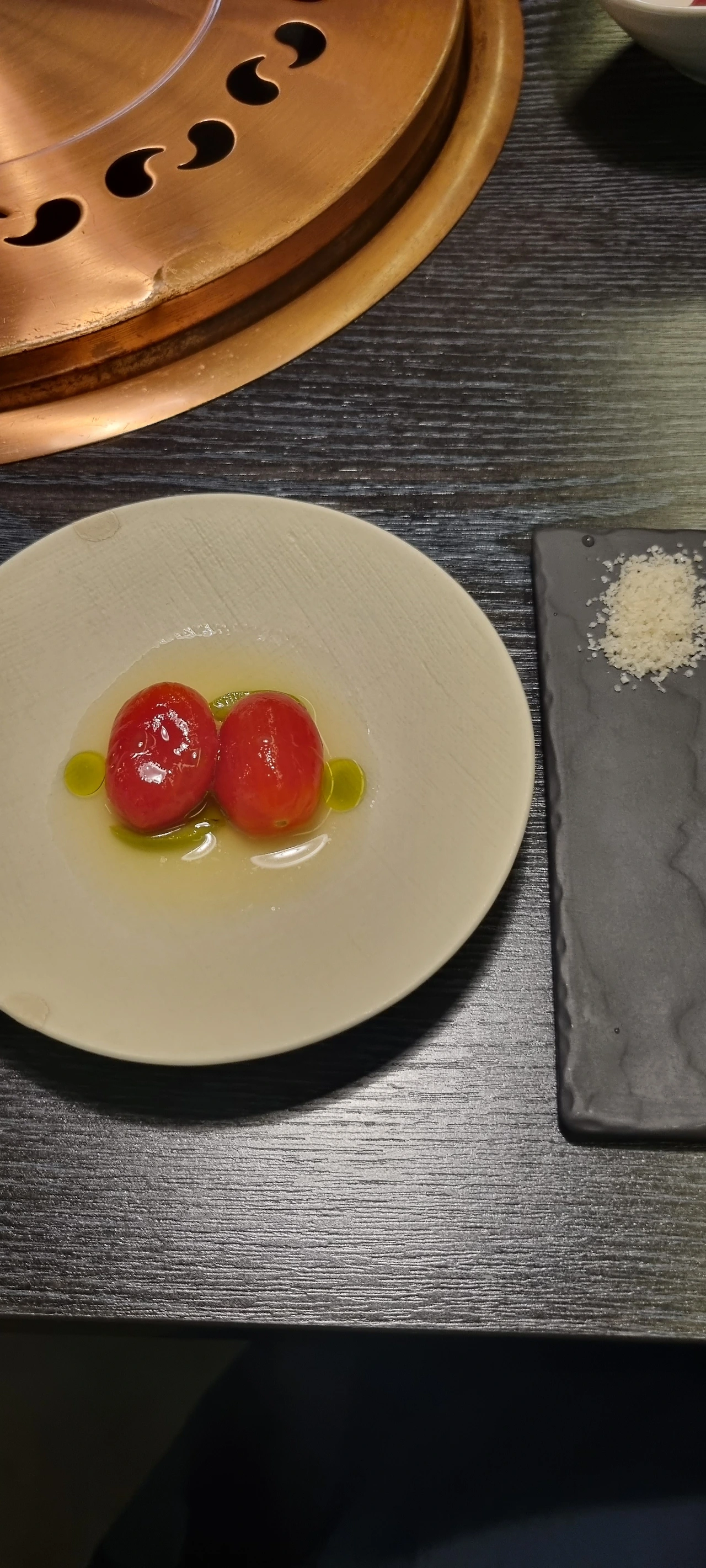 다음은 방울토마토 두 알이 나왔다. 두 알. 여긴 2를 좋아하나 보다. 바질 오일이라는 걸 화장품 병 같은 곳에 담아서 스포이드로 뿌려주셨다. 우와! 이 오일 마음에 든다. 토마토는 새콤달콤 상큼했고, 바질 향은 풍미를 더해줬다. 2알은 좀 탐탁지 않았지만, 전채요리로 배를 채울 수는 없으니 일단 괜찮다.