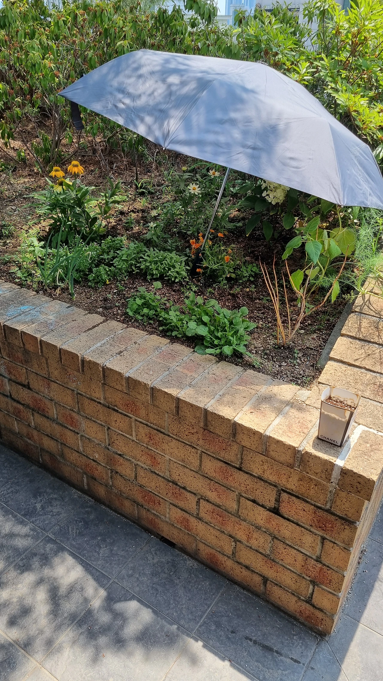 아침, 저녁으로 물 시중을 들었더니 그래도 수국은 잘 버텨주었어요. 유독 더운 올해, 외출하느라 오후에 한 번 안 줬더니 잎이 축 쳐져있더라고요. 설상가상 그다음 날 폭염주의보가 떴어요. 아침에 물을 먹고는 잎이 살아나는 듯했지만, 오후의 강렬한 해를 견딜 수 있을지 걱정이 됐답니다. 당장 그늘막을 칠 수도 없고, 머리를 굴리다가 방법 하나를 생각해 냈어요.