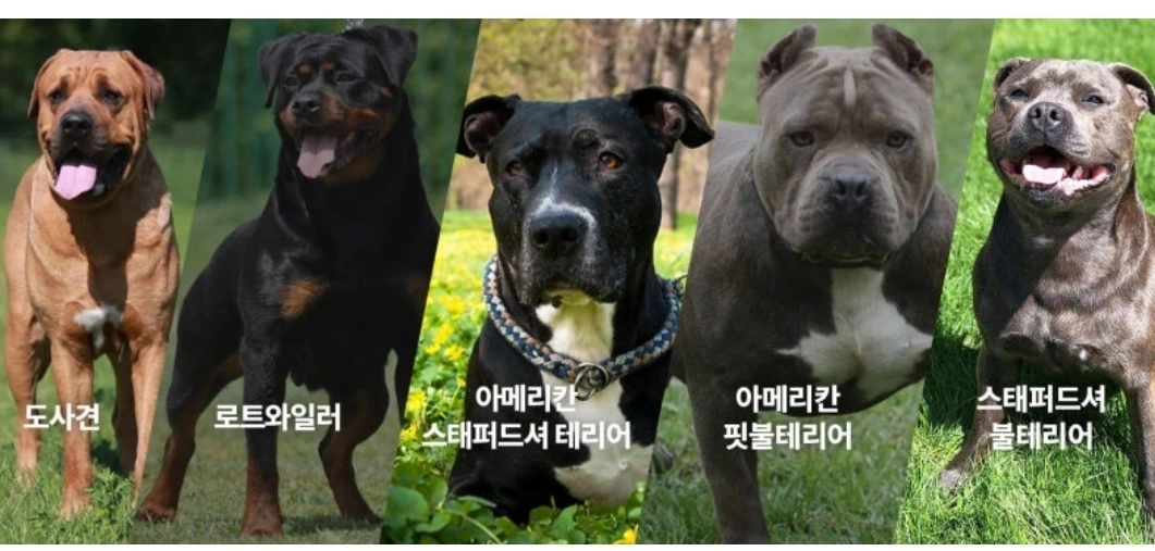 한국에서 입마개가 의무화된 5종의 개는 도사견, 로트와일러, 아메리칸 핏불테리어, 아메리칸 스태퍼드셔 테리어, 스태퍼드셔 불테리어 등입니다. 이 5개 견종의 잡종개도 해당됩니다.