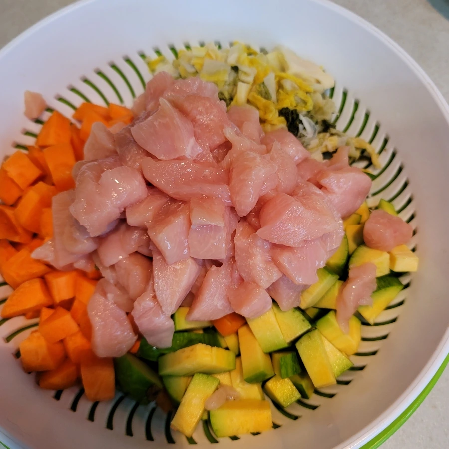 엄마가 만든 집밥에는 닭가슴살과 들깻가루, 당근, 호박, 양배추가 들어가요. 병아리콩과 완두콩은 삶은 다음 갈아서 넣고요. 얼마나 맛있는지 아세요? 가끔씩 엄마가 제 밥을 뺏어 먹을 정도로 맛있어요. 병아리콩의 고소함과 들깻가루의 은은한 향, 그리고 닭가슴살의 부드러운 풍미까지... 요즘에는 간혹 고구마와 참치, 황태포도 넣어줘요.