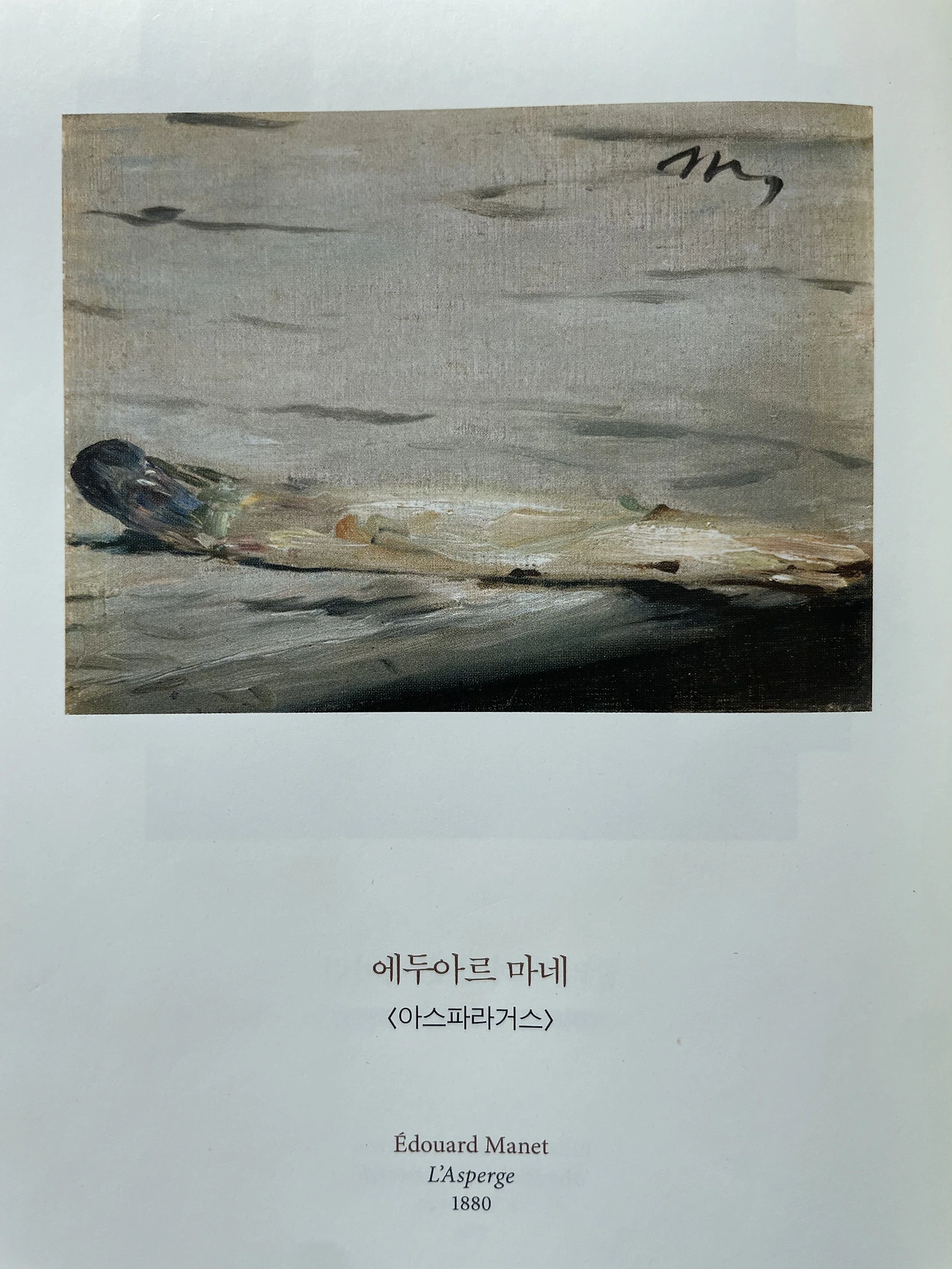"아, 그건 아니고, 그보다 재미있는 사연이 있지. 샤를 에프류시라는 당시의 대수집가가 아스파라거스 한 단이 그려진 그림을 주문했어. 화가는 8백 프랑에 그림을 넘겼고. 마네의 그림 한 폭이 수백만을 호가하는 오늘날에는 우스운 액수 같지만 전혀 시시한 금액이 아니었단다. 당시 평균 일급이 약 5프랑이었으니까. 어쨌거나 그 작품(지금은 독일에 있단다)을 받고 몹시 흡족했던 샤를 에프뤼시는 마네에게 천 프랑을 보냈지! 그러자 마네는 재치와 기발함, 관대함을 발휘해서 화폭에 이 아스파라거스 한 줄기를 따로 그린 뒤, 그 수집가에게 이런 말을 곁들여 보냈어. '선생에게 보낸 아스파라거스 단에서 하나가 빠져 있었소'. 마네는 따지고 보면 이 화폭에 '볼' 것이 별로 없다는 사실을 보게 만들어. 그저 아스파라거스 한 줄기, 혹은 평범한 탁자의 한 부분, 그리고 그걸로 그림을 그려서 선물하는 소소한 관대함이 있을 뿐이야. 약간의 관대함이 발동한 덕에 그 사물들이 그림 한 장에 담겨 선물로 제공될 수 있었지. 하지만 이 작품이 우리에게 말해주는 건, 바로 그 거의 아무것도 아닌 것이야말로 삶의 매력을 이룬다는 점이란다. 거의 아무것도 아닌 것, 그것만으로 삶은 충분히 빛을 발해. 우리가 지나쳐버리는 이 거의 아무것도 아닌 것들이 없다면 사물은 그저 사물에 불과할 거야. 뭔지 모를 것 하나만 있어도 사물들은 갑자기 그윽해지지. 영국인들의 표현 중 '적은 것이 더하다Less is more'라는 말이 완벽한 한 줄 요약이 되겠구나." (307페이지)