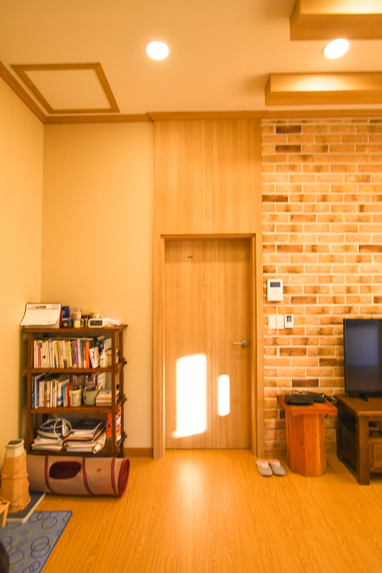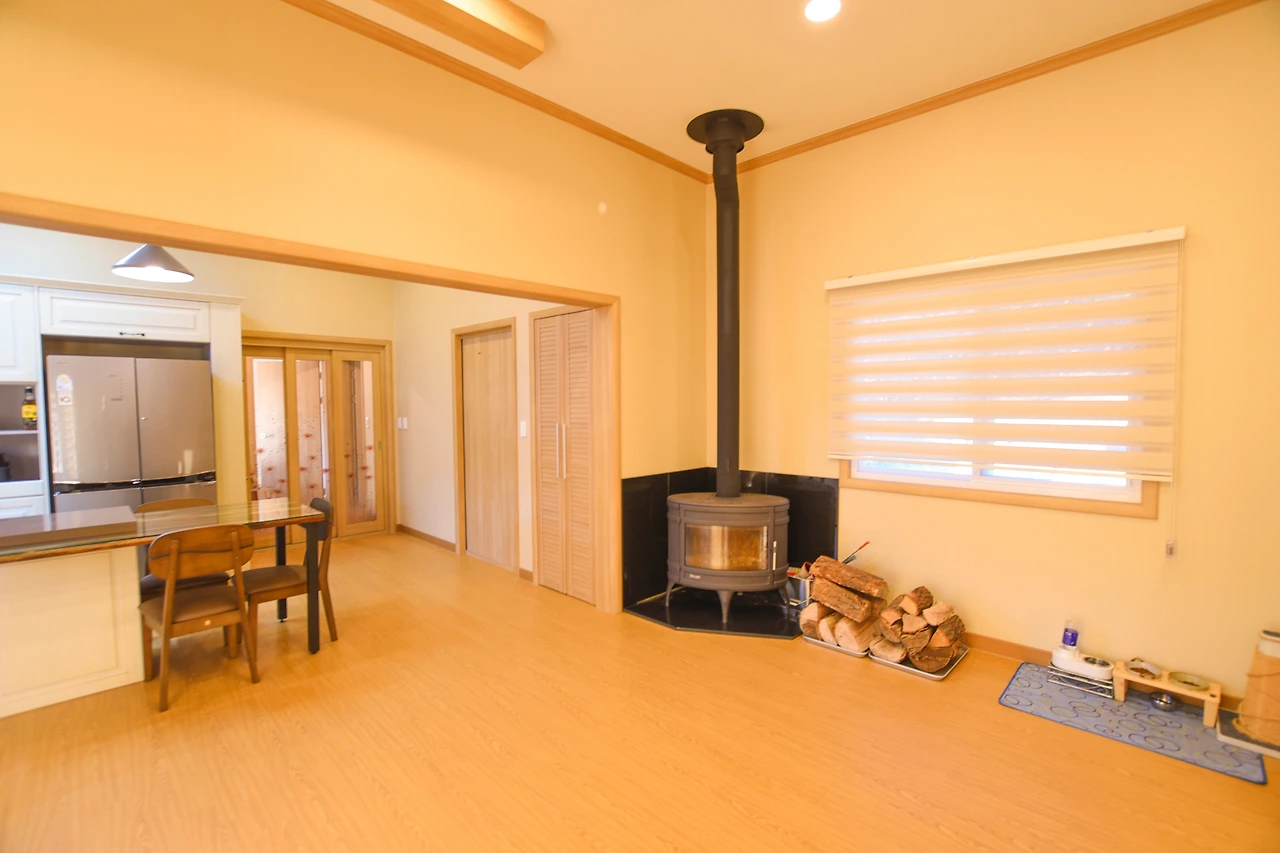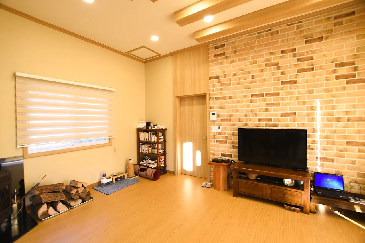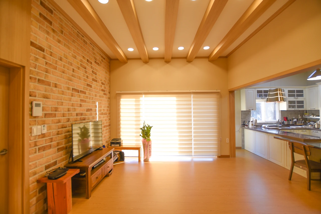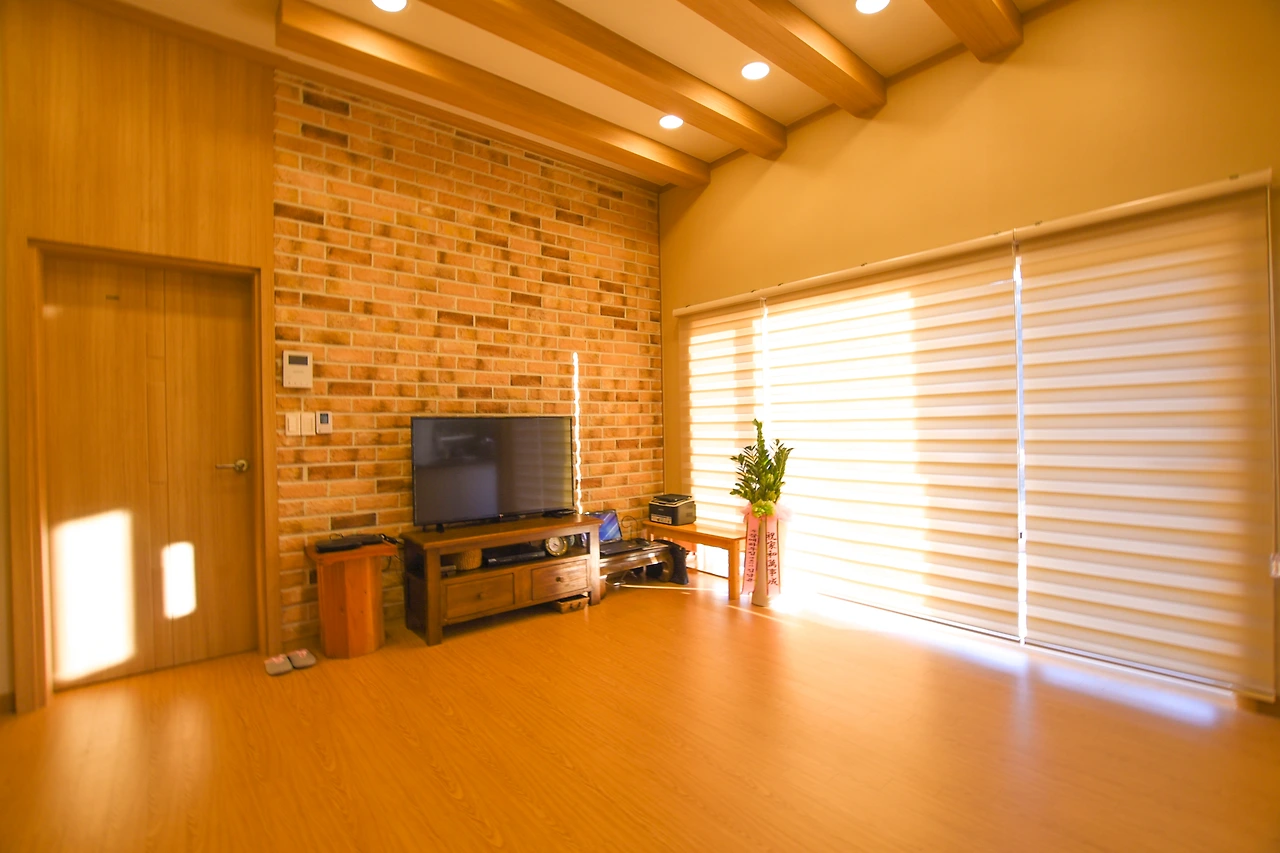 이번 주택의 거실에는 1층 오픈천장이라는 옵션을 더하였습니다. 기본적으로 천장 높이는 2.4m 입니다. 하지만 조금 답답할 수 있을거 같다는 건축주님 의견에 따라 1층 거실 공간 천장을 높이는 옵션을 적용하였고 약 3~3.5m 사이의 높이고 거실 천장을 구성하였습니다.