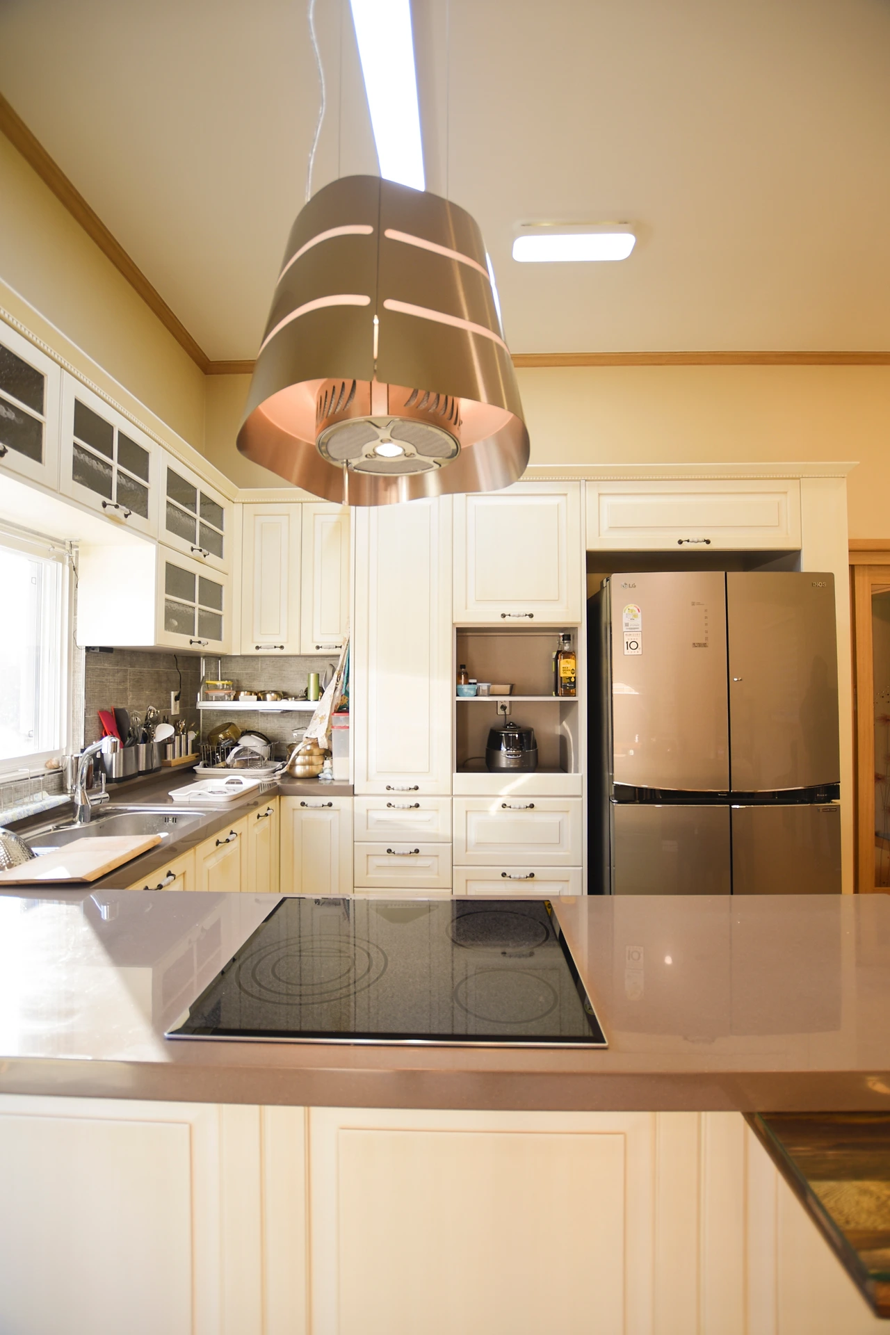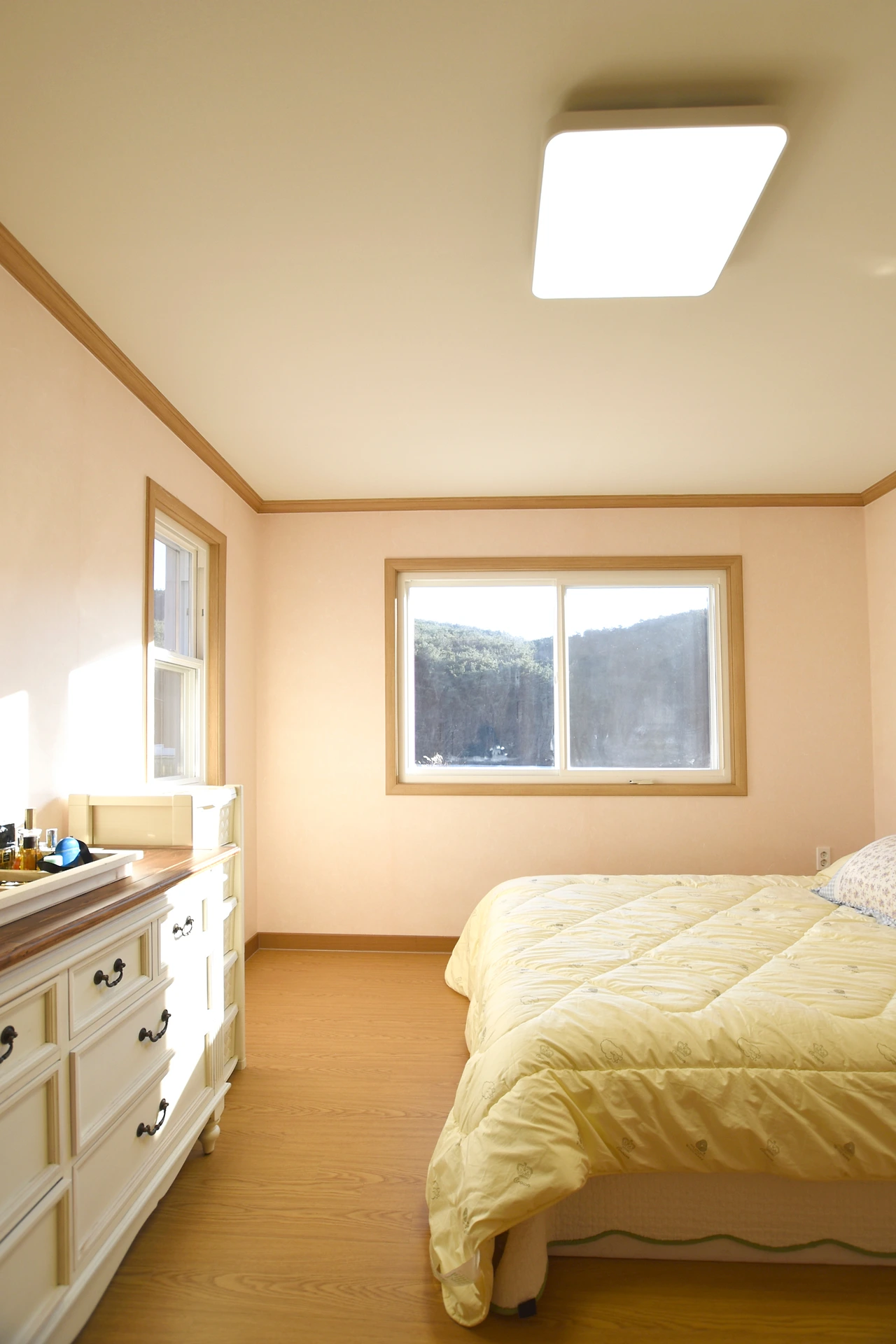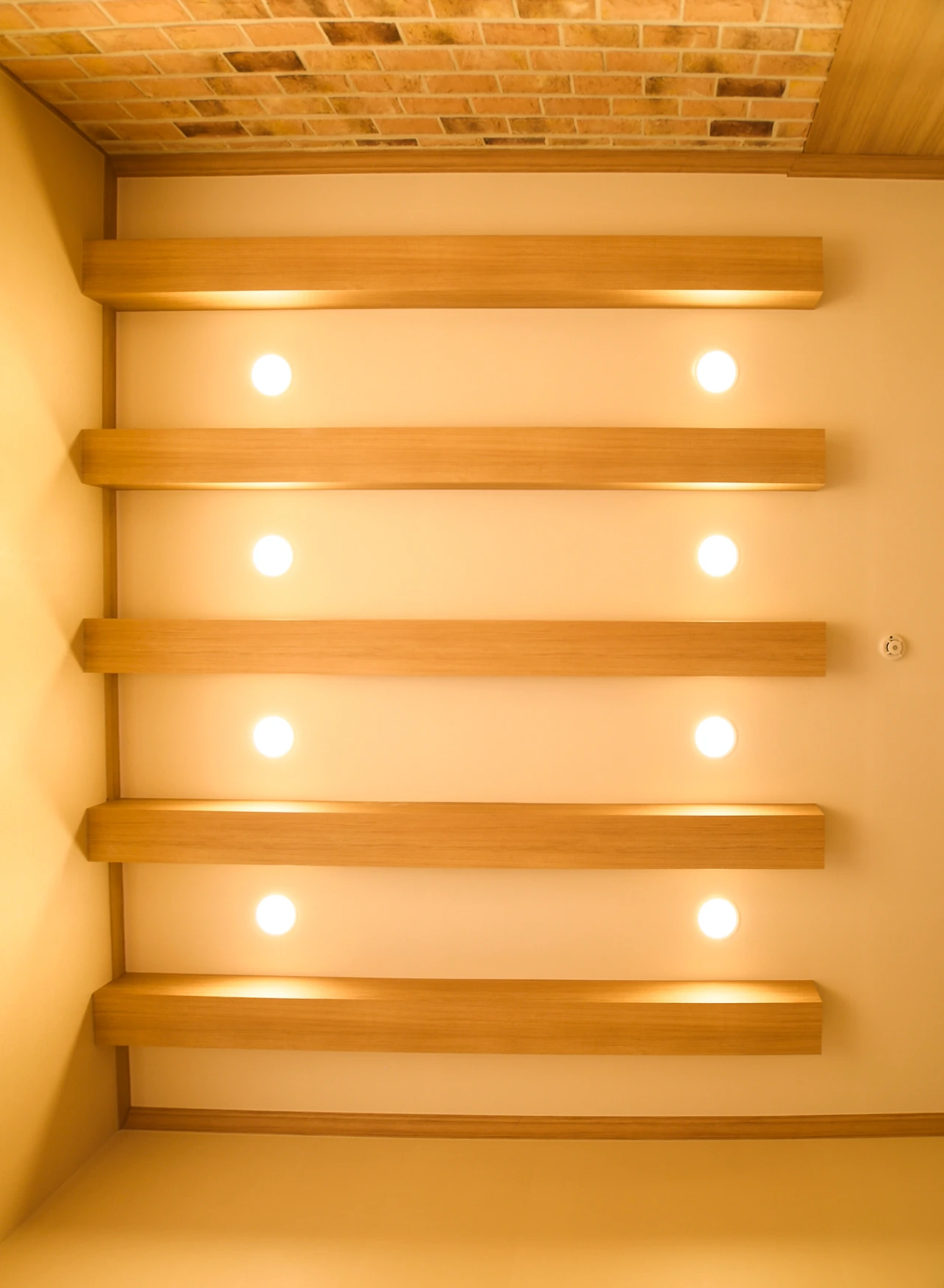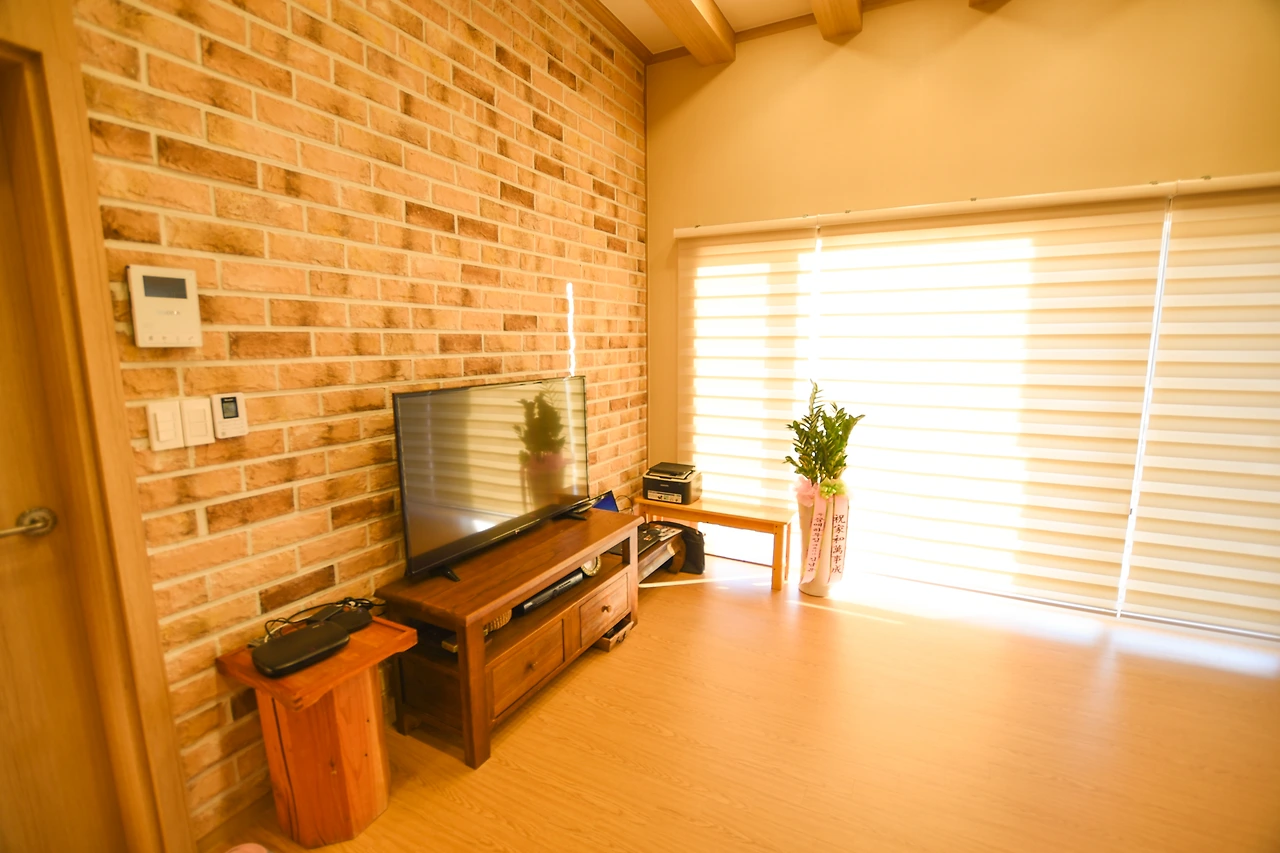 이번 주택의 거실에는 1층 오픈천장이라는 옵션을 더하였습니다. 기본적으로 천장 높이는 2.4m 입니다. 하지만 조금 답답할 수 있을거 같다는 건축주님 의견에 따라 1층 거실 공간 천장을 높이는 옵션을 적용하였고 약 3~3.5m 사이의 높이고 거실 천장을 구성하였습니다.
