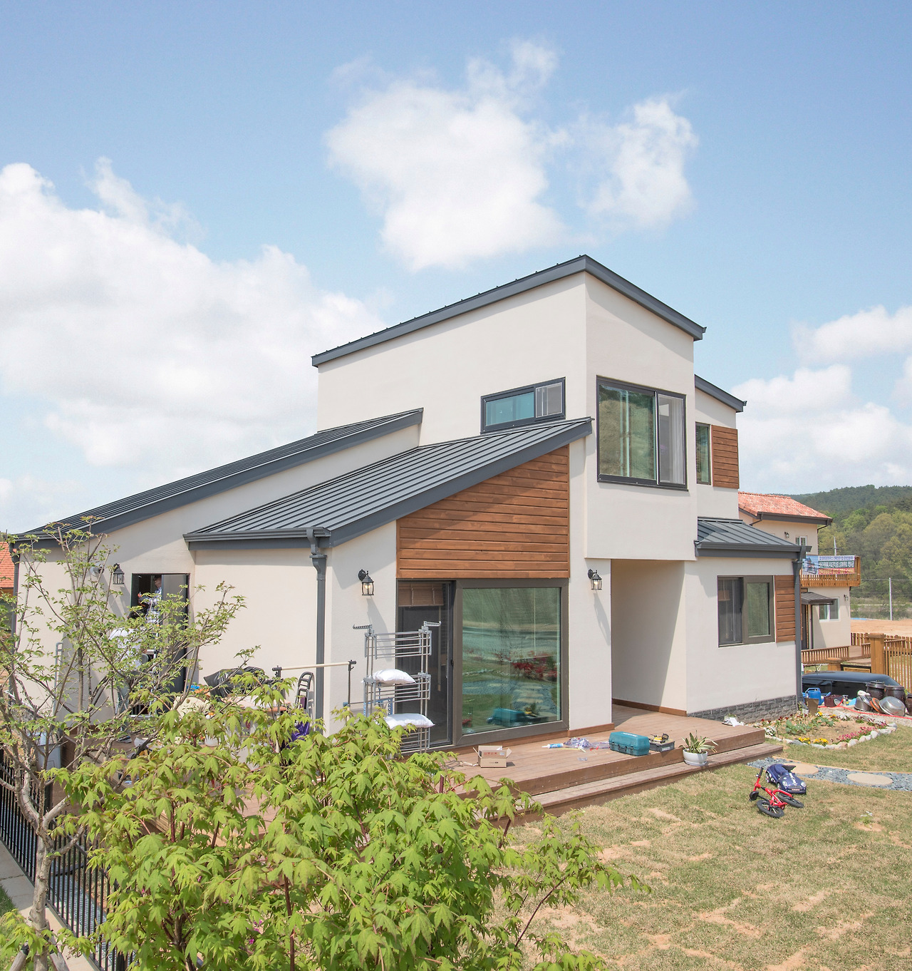 모던풍의 전원주택이기 때문에 이번 주택의 경우 젊은층의 구독자 여러분들이 많은 관심을 가지실 것 같네요. 최근 들어 북유럽식 주택 느낌보다는 실용적이면서 모던한 느낌의 주택을 많이들 짓고자 하십니다. 그만큼 젊은 느낌을 좋아하시는 분들이 많아진 것 같으며, 실질적으로도 젊은 분들이 많이들 짓고 있습니다. 예전 같았으면 무조건 돈 있으면 아파트지!! 라고 했었을텐데 최근에는 아파트의 인기가 시들해져서인지 젊은 신혼부부들도 자기만의 아이덴티티를 담은 주택을 많이들 짓고 있습니다.