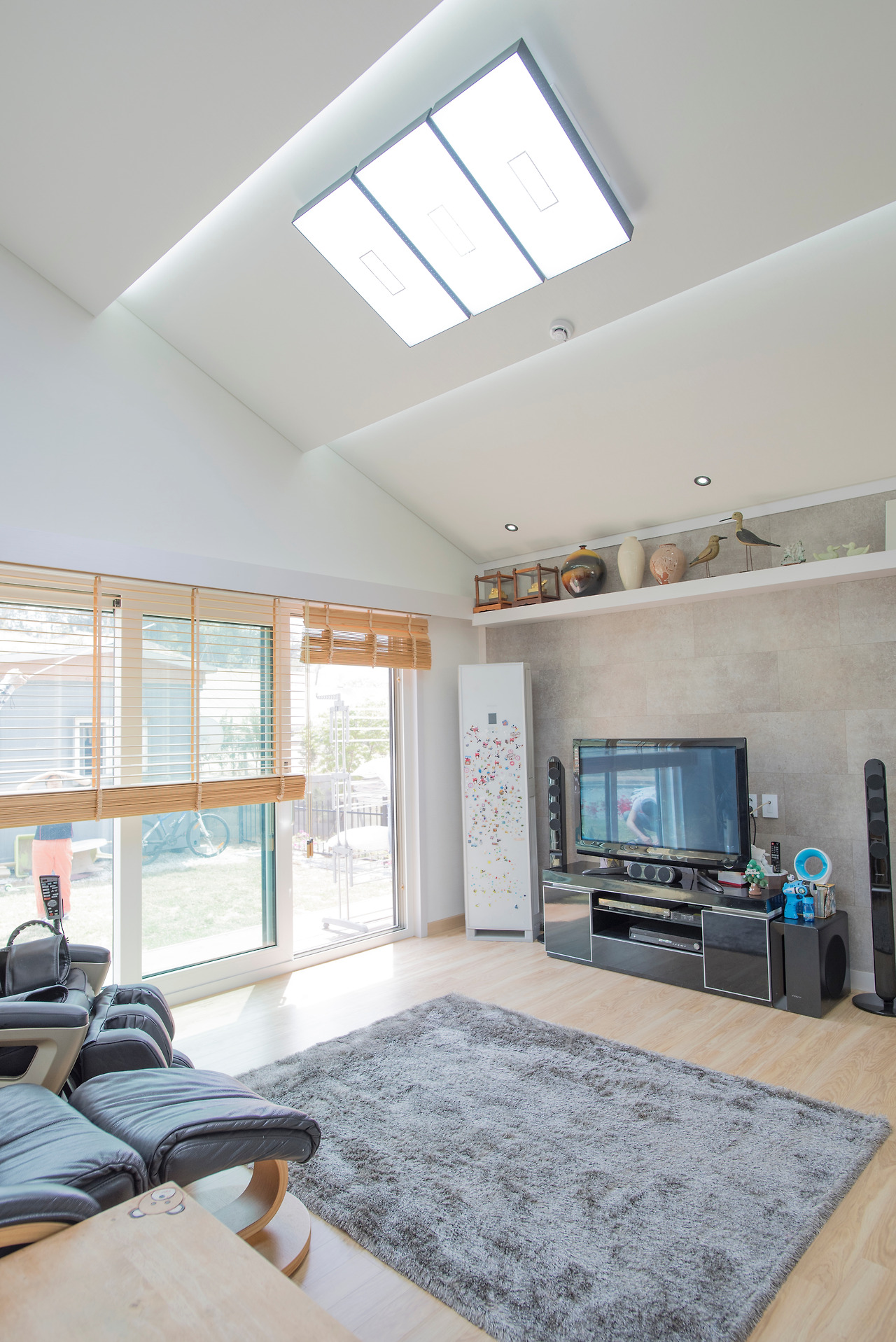 창호의 경우 기본 프레임은 화이트 입니다. 창호 프레임이 블랙으로 보여지는 이유는 화이트 프레임에 외부 블랙 랩핑 마감을 한 것이기 때문입니다. 모던한 느낌을 주기 위해 외부쪽만 랩핑을 진행하였으며, 내부의 경우 화이트가 인테리어적으로 더 느낌이 좋기 때문에 대부분 외부만 랩핑하여 디자인하고 있습니다. 외부 랩핑 비용은 창 값의 15% 정도이며, 집을 디자인 할 때 특별한 포인트가 없다면 창호 랩핑도 생각해 보시는 것이 좋습니다.^^