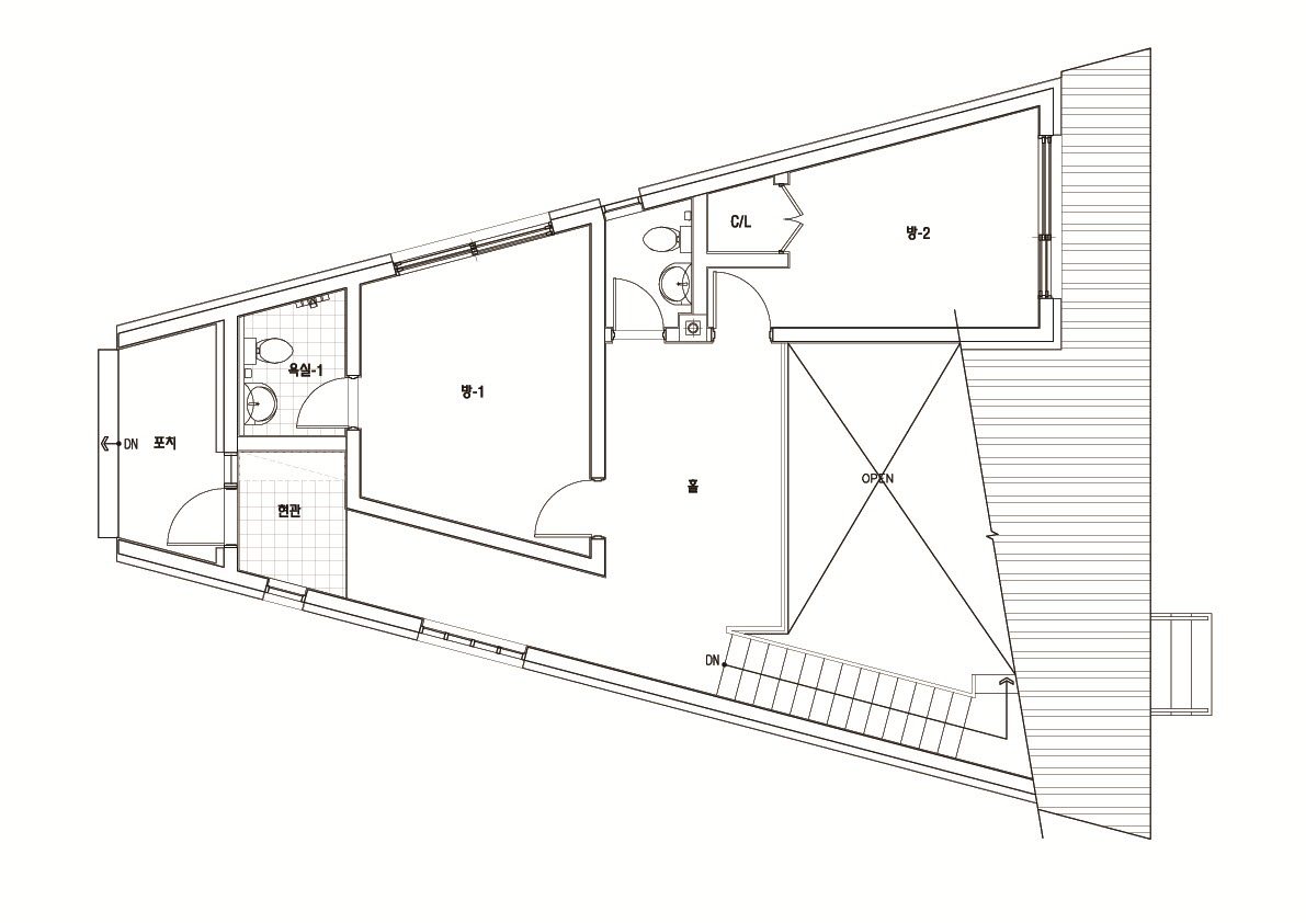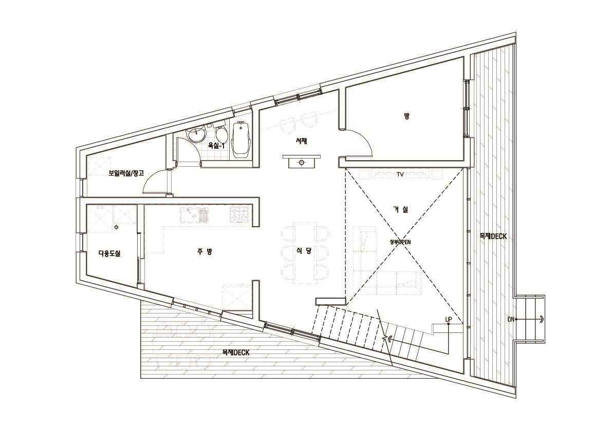 이번 주택의 특징은 또 한가지가 더 있습니다. 그것은 바로 평면구성 입니다. 도심지의 단독주택을 짓는다는 가정으로 진행하였으며, 땅의 모양이 일정하지 않고 주변 상황에 따라 열악할 수도 있을 것이라는 생각하에 계획하였습니다. 사다리꼴 모양의 공간으로 배치되었으며, 최대한의 모든 공간을 사용할 수 있도록 계획하였습니다.^^