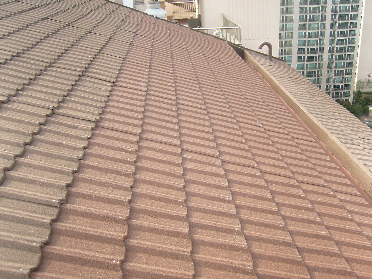 일반 기와나 콘크리트 지붕과 비교하면 무게가 1/6 정도밖에 되지 않는 가벼운 기와입니다. 무게가 가볍기 때문에 하중에 영향을 주지 않아 구조적 건축비가 절감된다는 장점이 있습니다.