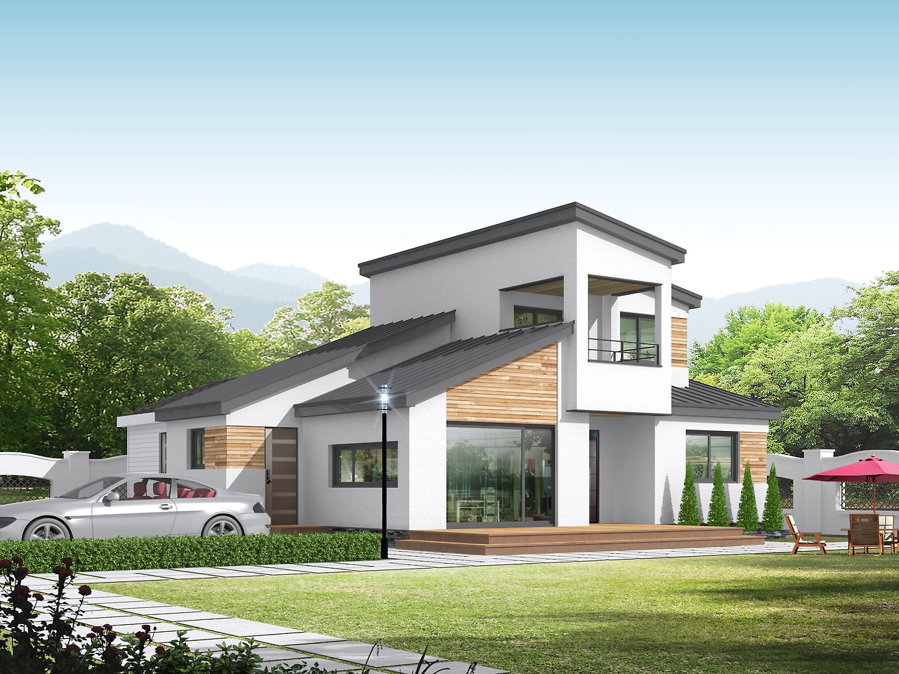 이번 주택의 경우 모던함을 표현하기 위해 지붕만을 리얼징크로 사용하였으며, 외벽에 붙이는 자재는 스타코플렉스와 적삼목사이딩만을 사용하여 원하는 예산 안에서 외관 디자인을 만들어 낼 수 있었습니다.^^