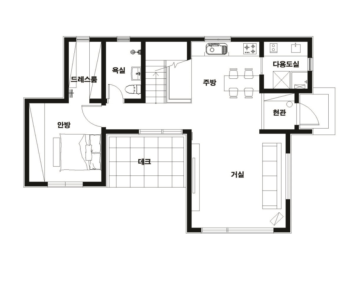 총 30평(99.67㎡)으로 설계되었으며, 1층 64.68㎡(19.5평), 2층 34.99㎡(10.5평)으로 계획되었습니다. 주방과 거실을 과감하게 1자 오픈시켜 작은 평수 대이지만 공간 활용이 극대화될 수 있도록 계획하였으며, 중심부 데크를 중정 개념으로 디자인하여 활용도를 높일 수 있는 설계를 진행하였습니다.^^